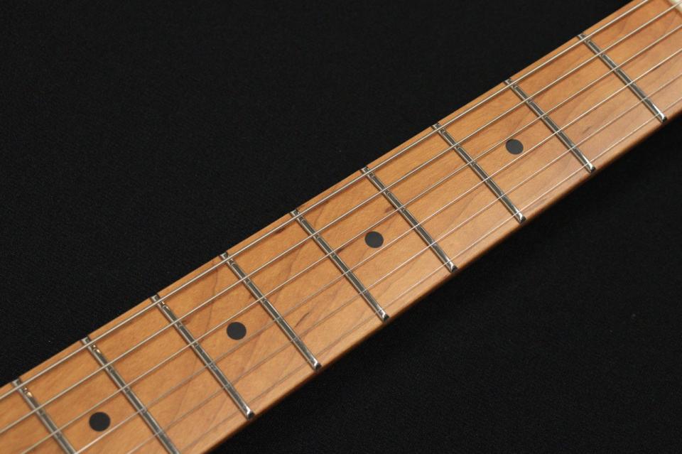 指板とネックにはエステック処理されたメイプル材を使用しています。エステック処理とは宮城県で開発された木材への窒素加熱処理技術で、ギター材としての採用は世界初です。