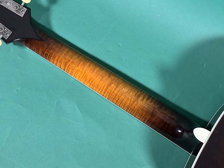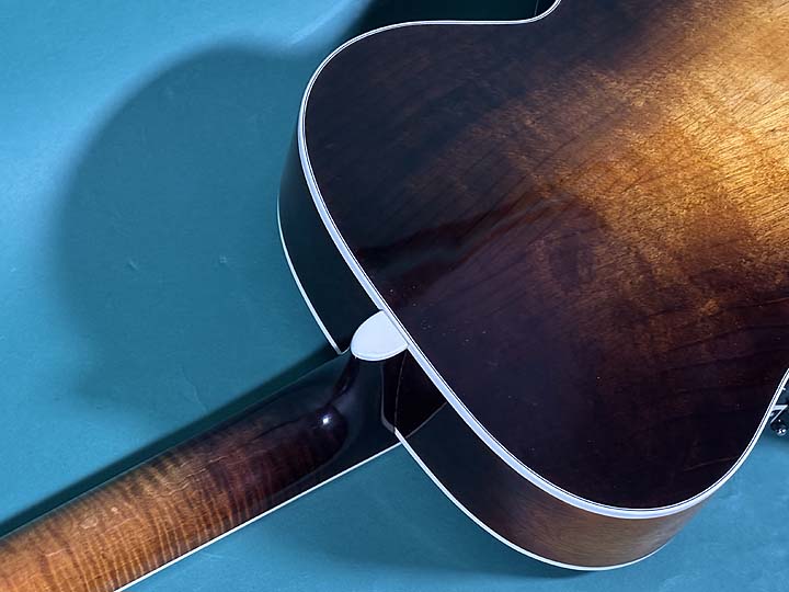 トップはアディロンダックスプルース、サイド、バックはバーチ、美しいトラ目メイプル1ピースネック、エボニー指板、エボニーブリッジです。