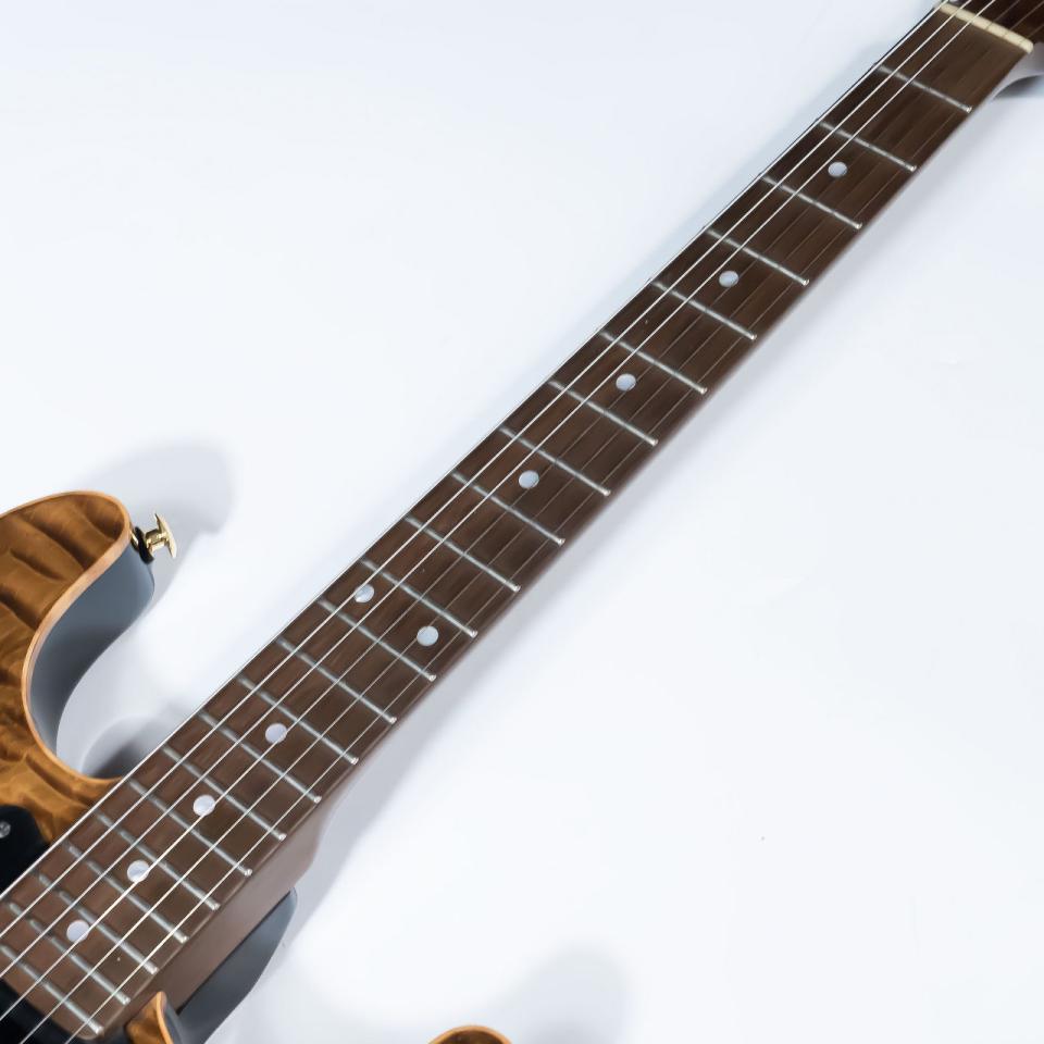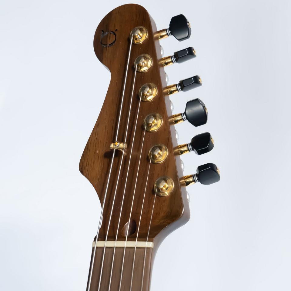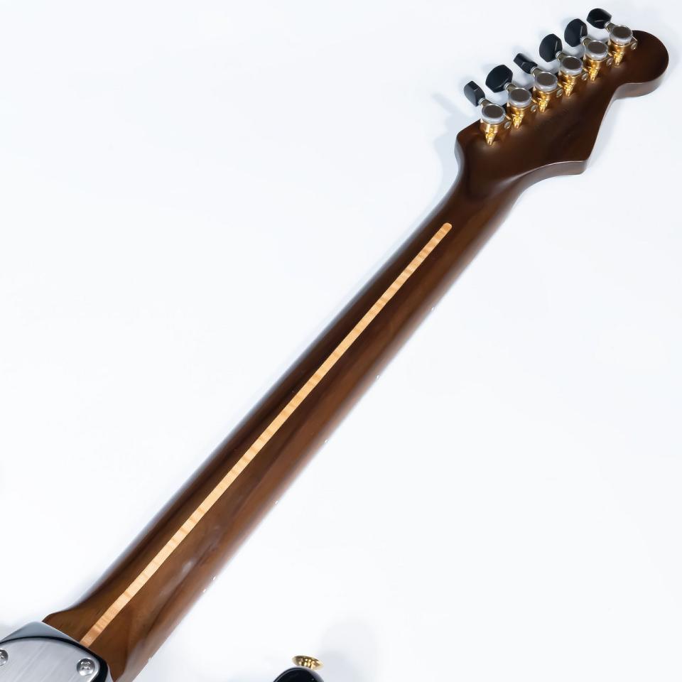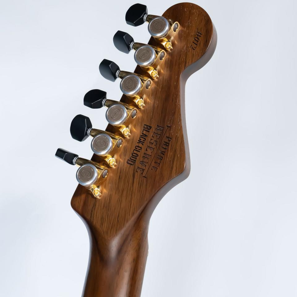 ミニスイッチを二つ配置し、ブラッククラウドオリジナルPUの「Black Smoker」を「シリーズ、タップ、パラレル」の切り替えが出来ますので幅広いサウンドメイクが可能になっています。トップだけではなくネックも1ピースのインディアンローズウッドを採用しています。アドナイズドピックガードにゴールドパーツで装飾された本機はクラフトマンの拘りが垣間見えます。