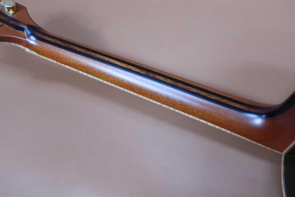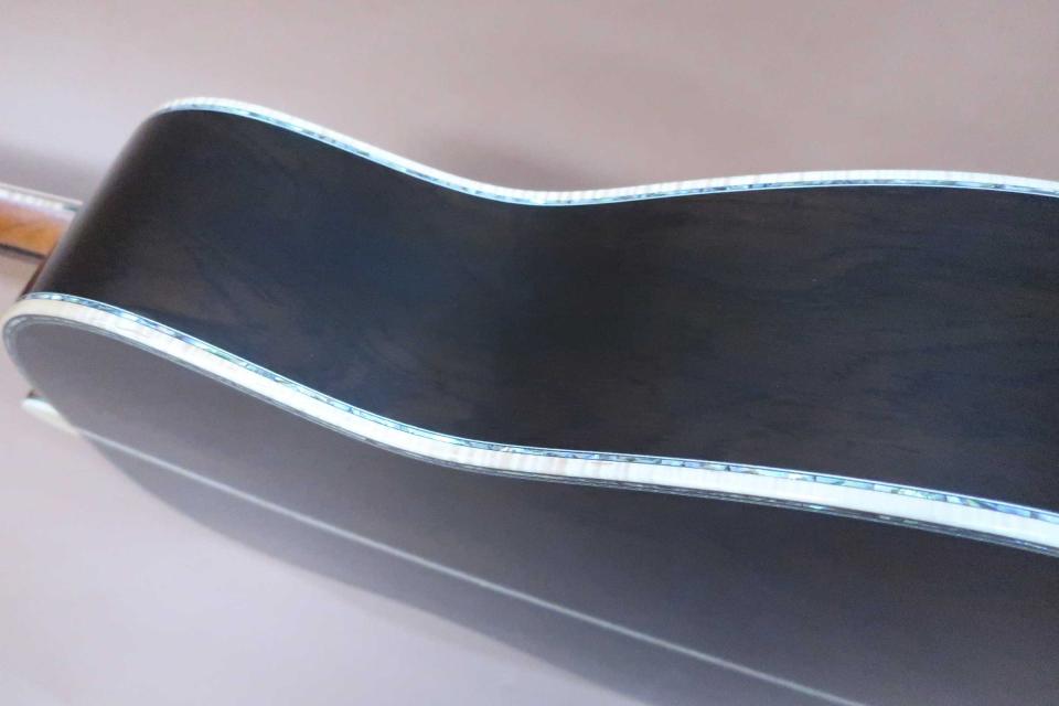 サウンドは弦振動を余す所なくボディに伝達される積層ネックに、表板はノンスキャロップドXブレイシングが採用されおり、野太くスケール感のある伸びやかな深みの有る低域に輪郭を帯びながら音抜けする粒ダチの良い中域に、煌びやかで艶やかな倍音豊かな高音域は正にテリー・サウンドです。本ギターは完成ホヤホヤですが既に素晴らしい鳴りで、更に弾き込めば塗装が馴染み使用材が弦振動で締まり更に奥行きの有る深く心地良い響きに育ってくれると思います。
