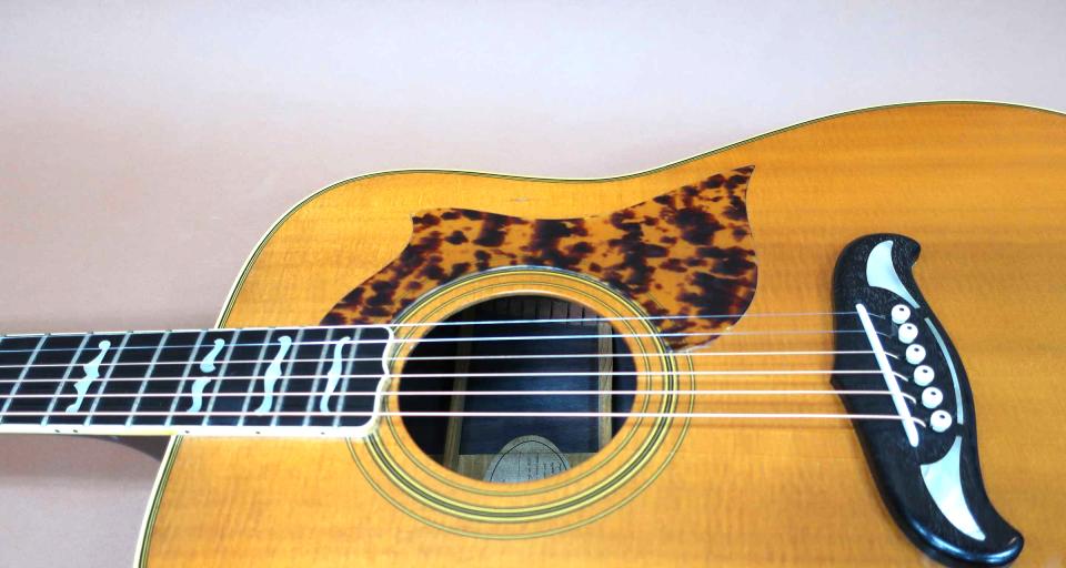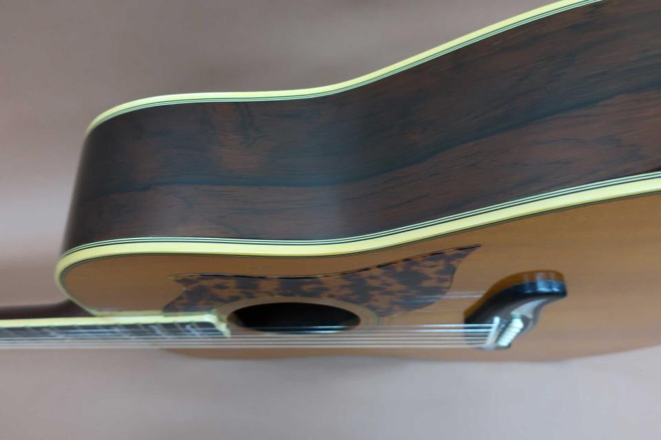 稀少な70年代の初期モデル、YAMAHA N-1000の入荷です。1975年12月の発売で83年頃には生産を完了した希少モデル。。本器はトップがスプルース単板、サイド&バックには板目のワイルドな杢の稀少なのハカランダ材が使用された初期モデルになります。中島みゆき氏もデビュー当時に初期モデルを使用されており、『時代』の初版レコードジャケットには、世界歌謡祭のステージでN-1000を弾くスナップ写真がジャケットに使用されており、ご存知の方も多い稀少モデルです。本器はオリジナル・ゴールドペグ、L-51 Customと同タイプの白蝶貝ポジション・マークが採用され、エボニー指板&ブリッジ、べっ甲柄ピックガードに、髭ブリッジも個性的でルックスも抜群なレア・ギターです。サウンドは'70年代のフォーク全盛の頃の懐かしい伸びやかなスケール感の有る低域にシャープで歯切れがよく輪郭のハッキリした明るい軽快な鳴りは健在です!ヤマハギターでは稀少なドレッドノートタイプのボディスタイルで、軽快で明瞭な鳴りで音の奥行きも有り弾き語りなどには最適かと思います。