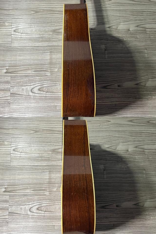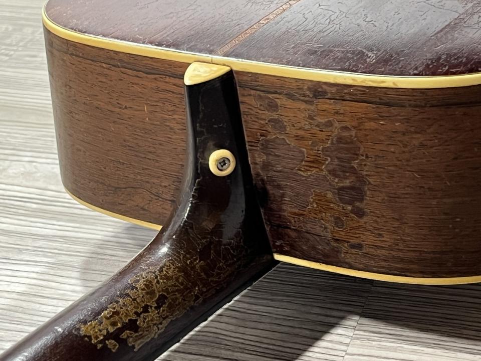 補修歴・調整歴について、ブリッジ剥がれ、貼り直し再接着あり、ブリッジプレートも大きめのものを再接着、表板歪み及び膨らみあり、ピックガード内側部割れ補修(接着及び割れ止めあり)、ネック調整、リフレット、ナット・サドル交換あり、長い年月の中で様々な補修・調整が行われてきた個体となります。
