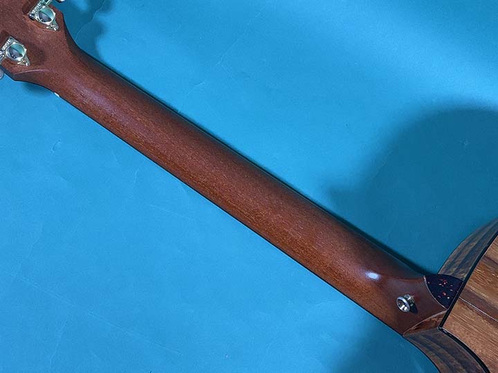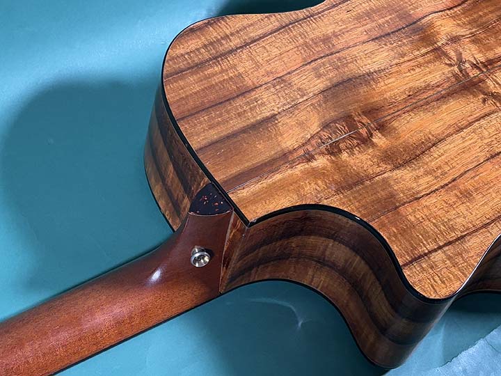 ボディシェイプはグランドオーディトリウム(GA)が採用されており、テイラーギターの中でスタンダードなボディシェイプで、抱え心地やサウンドバランスも安定しています。さらにカッタウェイボディーですので、ハイポジションまで使うソロギタリストにも弾きやすいです。