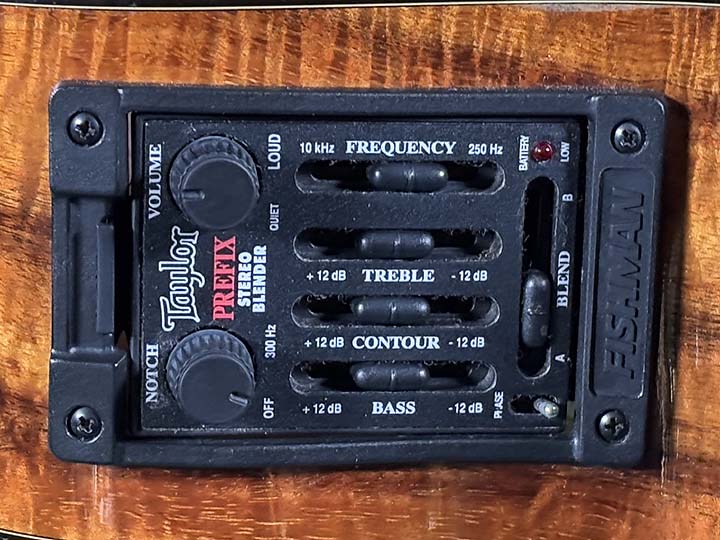 ピックアップシステムはFISHMAN製のPrefix Stereo Blenderが搭載されており、「Taylor」ロゴ入りの当時のままのオリジナルです。コントロールパネルもシンプルで扱いやすく、手元でのEQによる音作りのしやすさ、ピエゾとコンデンサーのミックスも可能で、エアー感のあるアコースティックサウンドを出力できます。