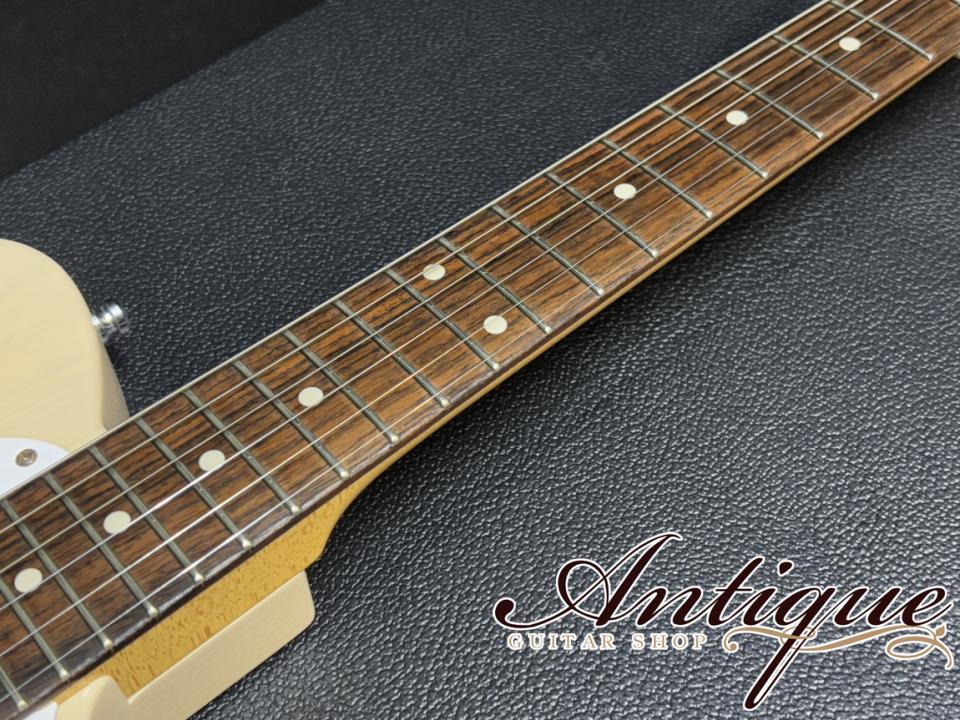 まずそのスペックとしては、ボディには非常に軽量かつ鳴りの良いライトウェイトのアッシュ材を採用し、総重量は約3.31kgとテレキャスモデルのベストウェイトとなっております。フィニッシュにはオリジナルのヴィンテージFenderでも特に人気の高いホワイトブロンド(US Blonde)カラーが採用されておりますが、こちらはUSA製同様に激薄の塗装となっており、塗装の下に見えるアッシュ材特有の美しい杢目と最高のマッチングを魅せ付けます。続いてネックにはトーン重視のフラットソーン(板目取り)にて、薄っすらながらフィギュアドライクなギラつきも感じさせる良質なメイプル材を採用。そして指板にはダークなコントラストの中に強い黒の杢目が走るハカランダを彷彿させる良質なローズウッドを採用。その他としては、ホワイトドットポジションマーク、ミディアムジャンボフレットのツバ出し22F使用、ヴィンテージスタイルを踏襲した溝切無し3Pサドルのブリッジ、8点留め1Pホワイトガード、ヴィンテージスタイルのクルーソンチューナー、ネックシェイプは60年代初頭を意識した細すぎず太すぎない抜群の握り心地となるCシェイプ、指板ラディアスは9.5”R、オリジナルヘッドシェイプにブランドロゴ、ヘッド側トラスアジャスト、ヴィンテージからの歴史を繋ぎつつも、演奏面に特化したモダンなテイストを加えたJ.W.Black氏のセンスの光るスペックとなっております。