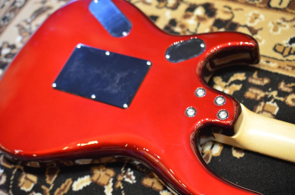 ボディ裏から4点、フロント・ピックアップの下部から1点、計5点止めです。通常のボルト・オンに比べネックとボディの接続面積が広いので、より音の伸びが良くなります。同時にネックとボディの僅かなぐらつきも無くなります。
