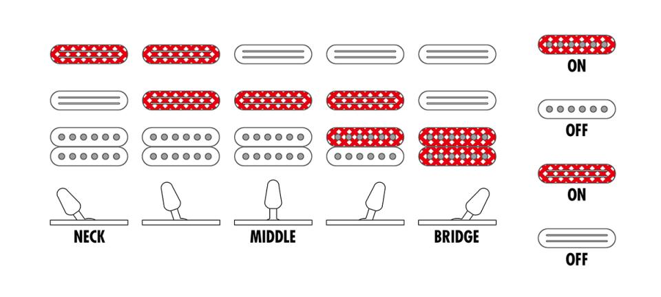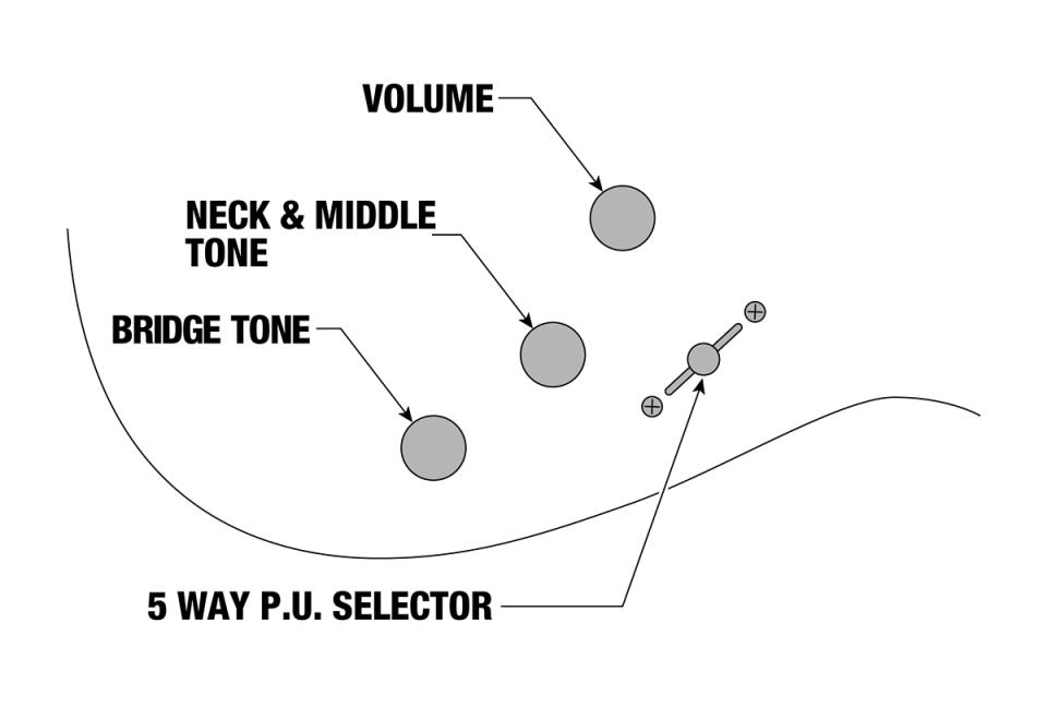 - Controls, Pickup selector 1 Volume, 2 Tone, 5-way lever switch