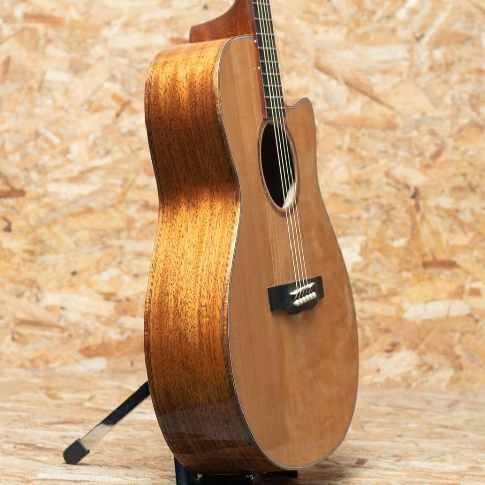 長野県松本市に工場を構えるモーリスギター。国内を代表する老舗ブランドの1つです。本器はフィンガーピッカー向けに開発されたモーリスSシリーズの最新作”SC-61”他のSシリーズと同サイズの表板面積ながら、厚みが薄くデザインされているSCボディを採用。抱えやすく、適度に低域の倍音が抑制されているので中~高音域のメロディラインを際立たせたいフィンガースタイルギターに最適です。シダートップ、マホガニーサイド&バック、フォワードシフテッドXブレイシング、マホガニーネック、エボニー指板&ブリッジ、ゴトー製ロトマチックペグ、カッタウェイ仕様。トップ&バック単板仕様の本格派。仕上げの丁寧さ、各部のセットアップの巧みさは国産ならでは。仕様と品質を考えれば価格もお手頃です。これからソロギターを始めたいという方にピッタリな1本です。オリジナルハードケース付属