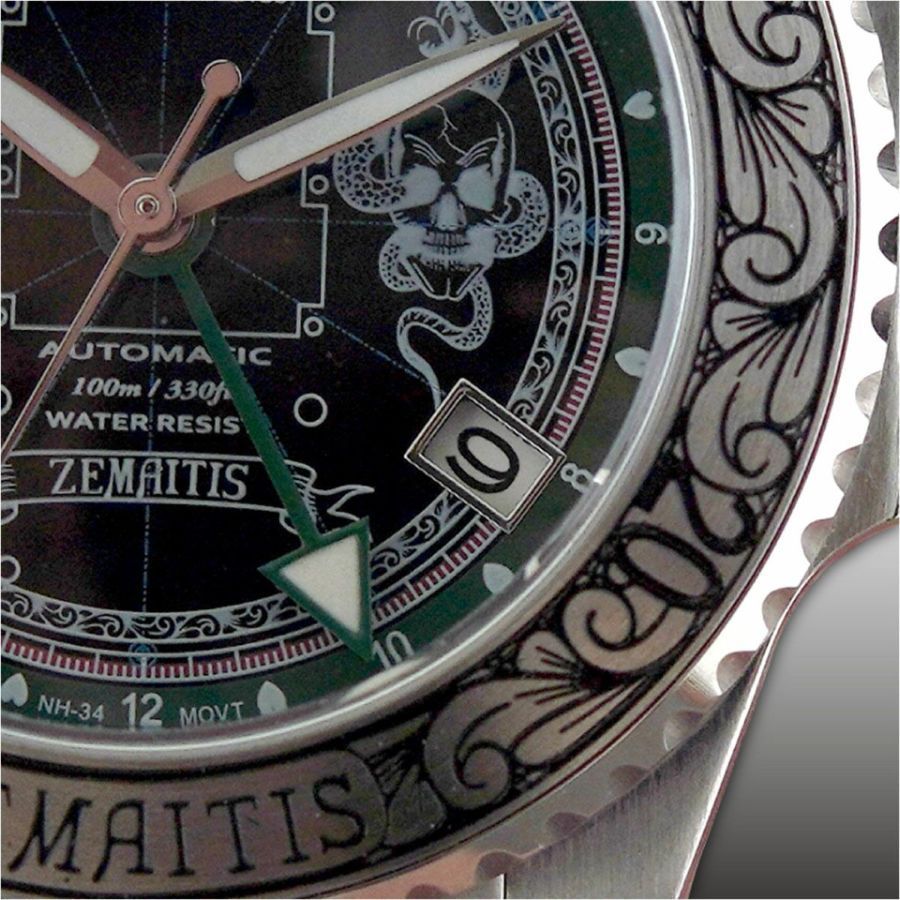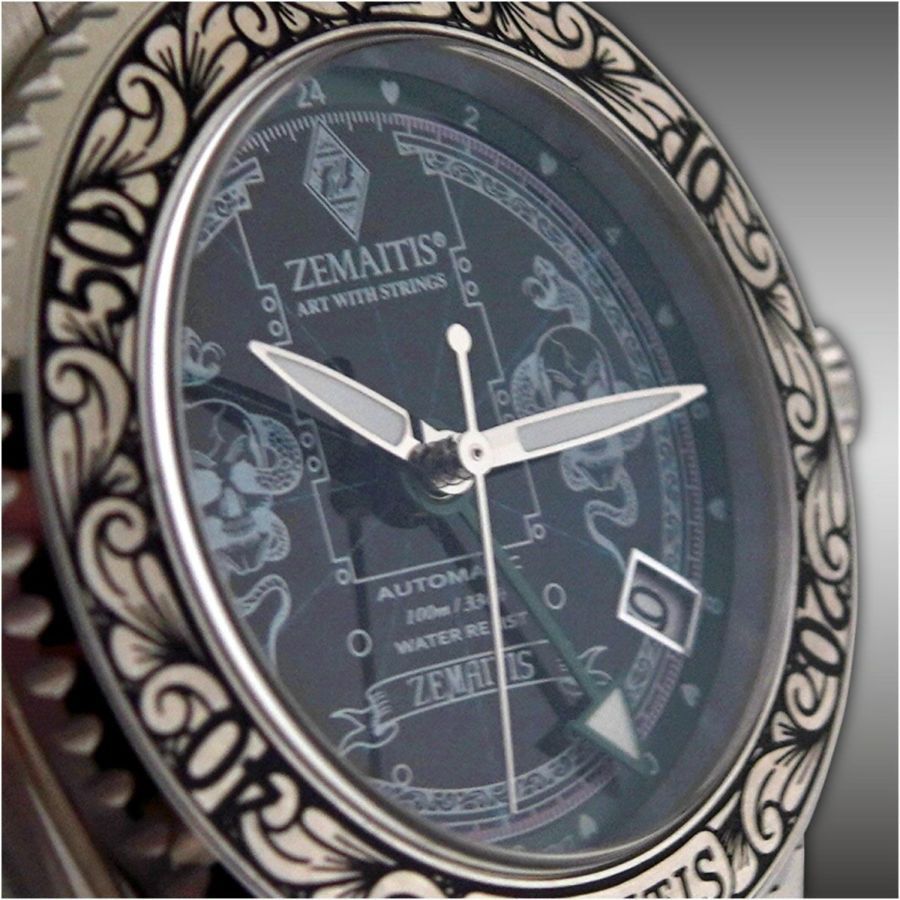 文字盤デザインは、ディスクフロント・モデルのスカル&スネークのピックガード図面と彫金デザインを24Hインナーサークル内側にプリントし、12時位置にダイアモンド型のZエンブレムのプリントを配しました。