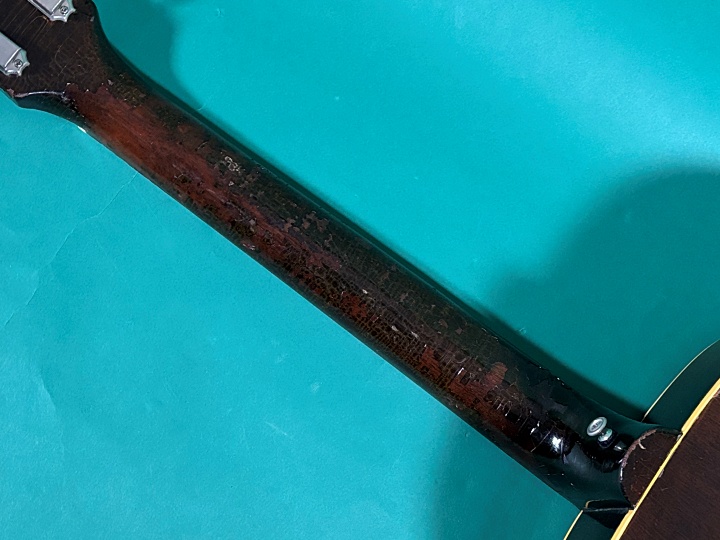 全体にバリバリウェザーチェックが入っており、特にネックバックはボロボロ取れてタッチアップされた箇所がかなりあります。