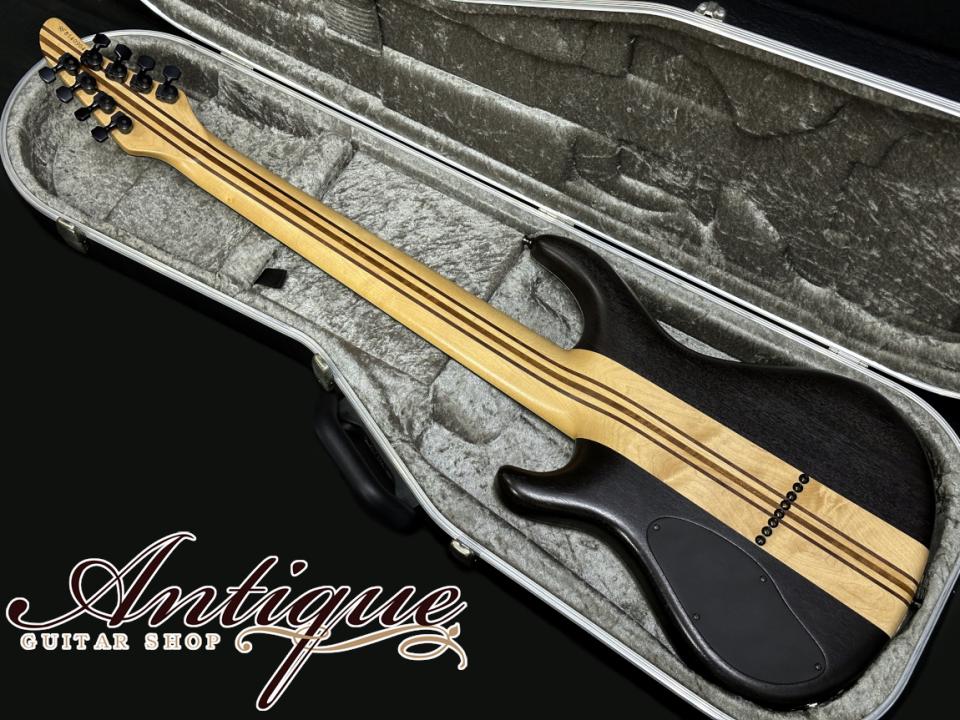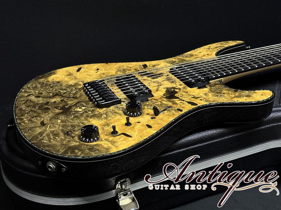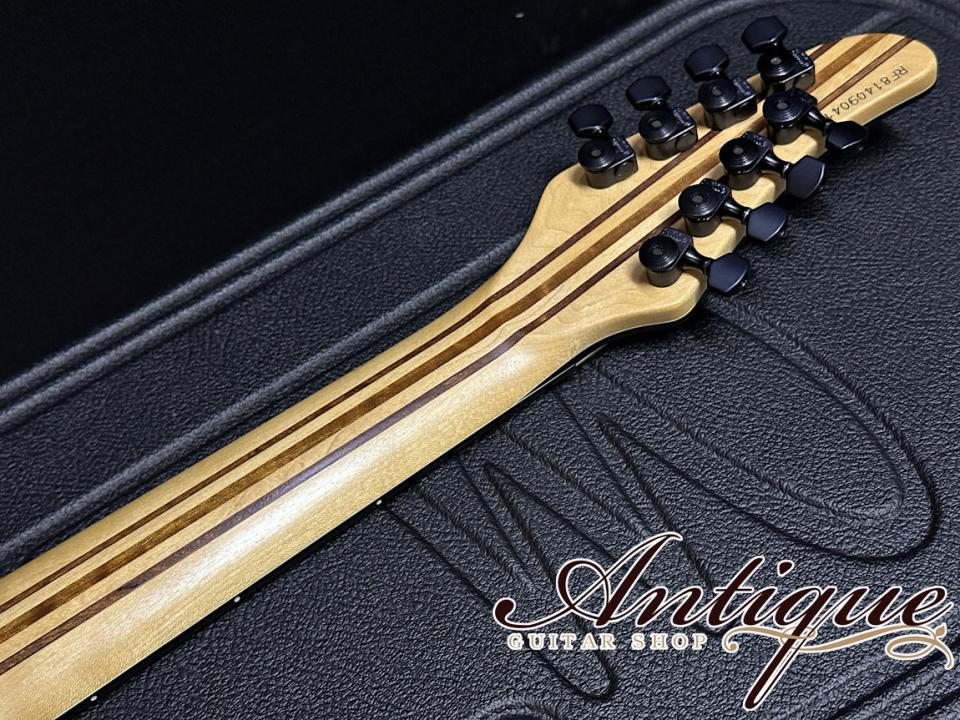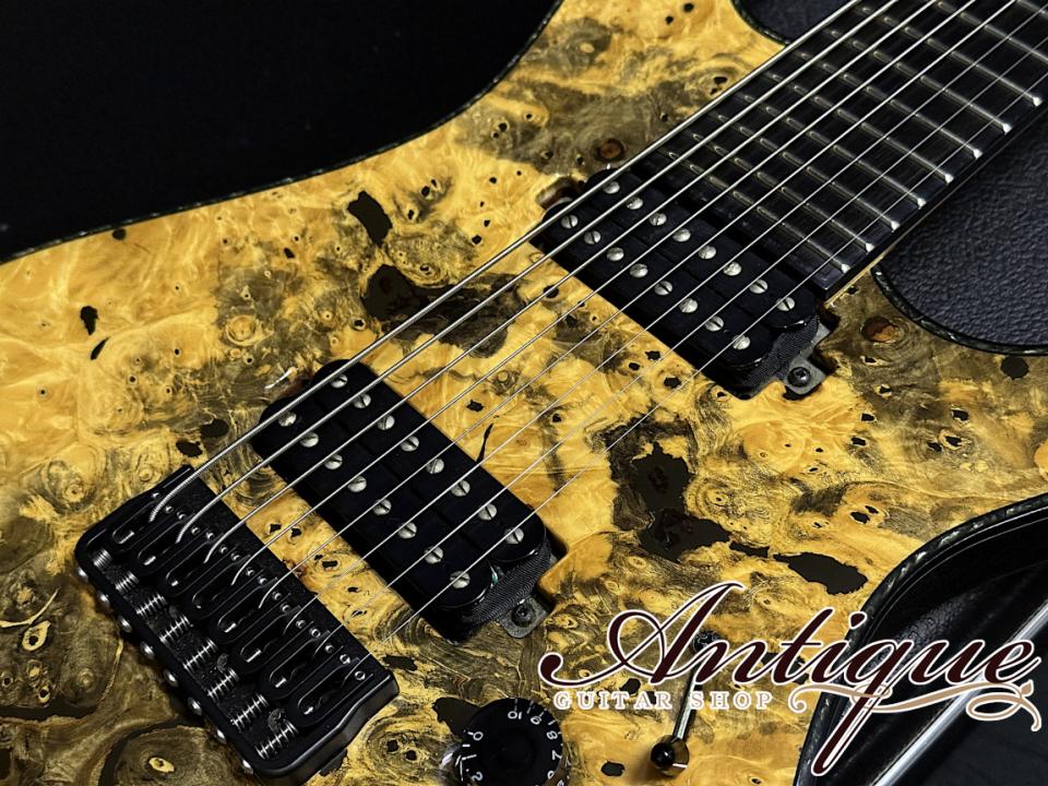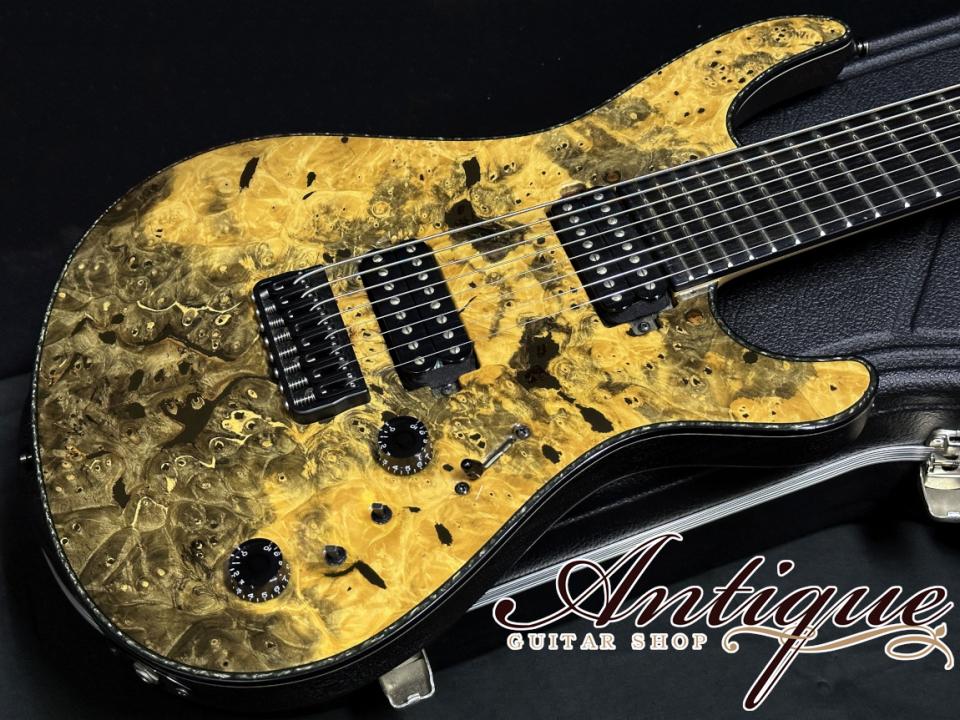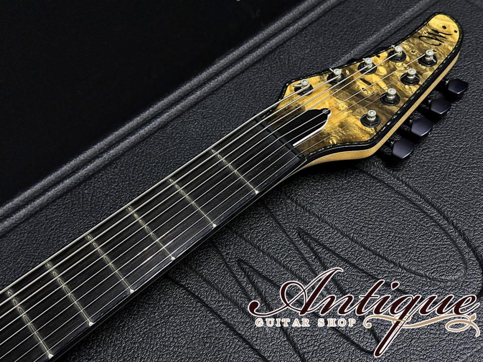 まずそのスペックとして、ボディトップには見た瞬間に強烈なインパクトを与える極上のバックアイバールを採用。まさに自然が生んだ奇跡とも言える杢目を持ち、センターブックマッチにすることで左右対称な芸術的なルックスとなっております。フィニッシュカラーは、その杢目を活かしたトランスナチュラルのグロス仕上げとなっております。バインディンクにはブラックABSに加えてブラック・パーロイドを採用した豪華な仕様。ボディバックには良質なマホガニーを採用し、こちらはモノリスブラックのマットアッシュカラーにて仕上げられております。ネックはスルーネック構造にてMaple-Mahogany-Amazakoe-Wengeの強固な11P仕様。指板には高級材であるエボニーを採用、ヘッドストックはボディ同様マッチングのバックアイバール&バインディング仕様。その他としては、裏通しのHIPSHOT製フィクスドブリッジ、ミディアムフレット(FERD WAGNER NS 2.64×1.20)24F、27インチスケールのバリトーン・バージョン、スパーゼルロッキングチューナー、指板サイドのポジションマークは蓄光ルミンレイ、シャーラーロックピン、トラスロッドカバーはフォーラムカスタムと、オプションを含む拘りのスペックが確認出来ます。また総重量は約4.06kgと8弦仕様の中ではズバ抜けて軽量という点もプレイヤーの方には嬉しいポイントです。