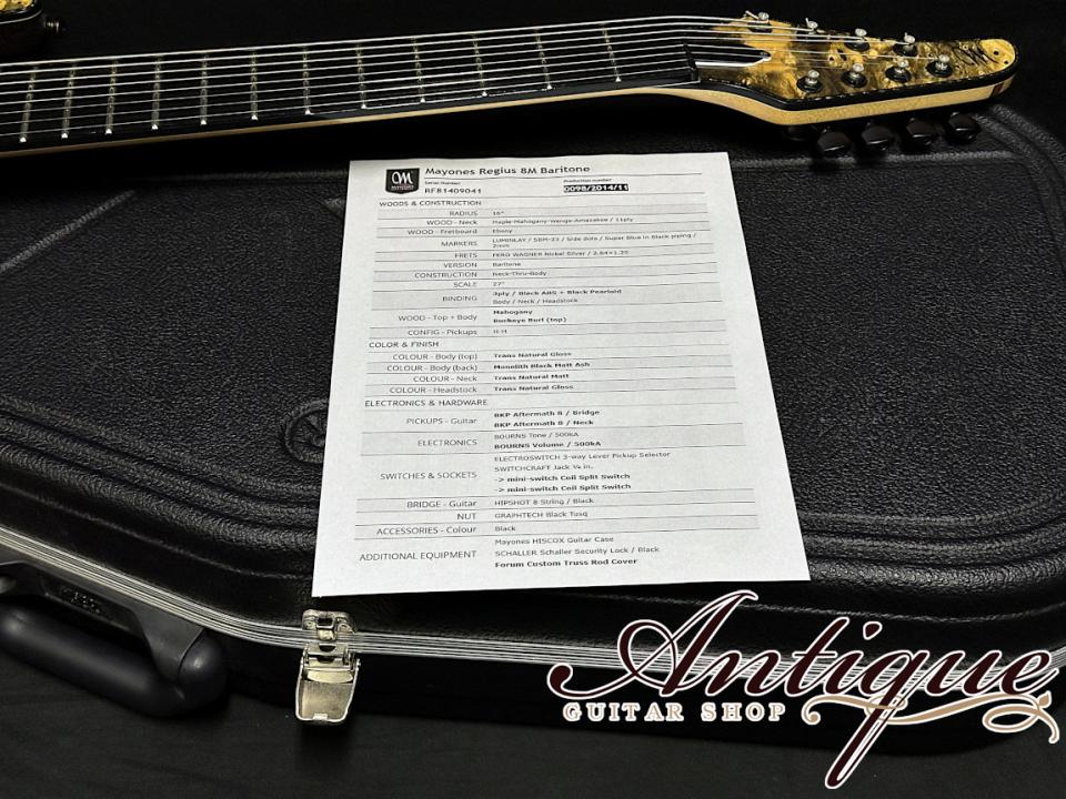 | 商品名 | MAYONES Regius 8M Baritone Neck-Thru 2014 Trans Natural Gross w/BK PU EX+++ 4.06kg "Killer Buckeye Burl Top" |