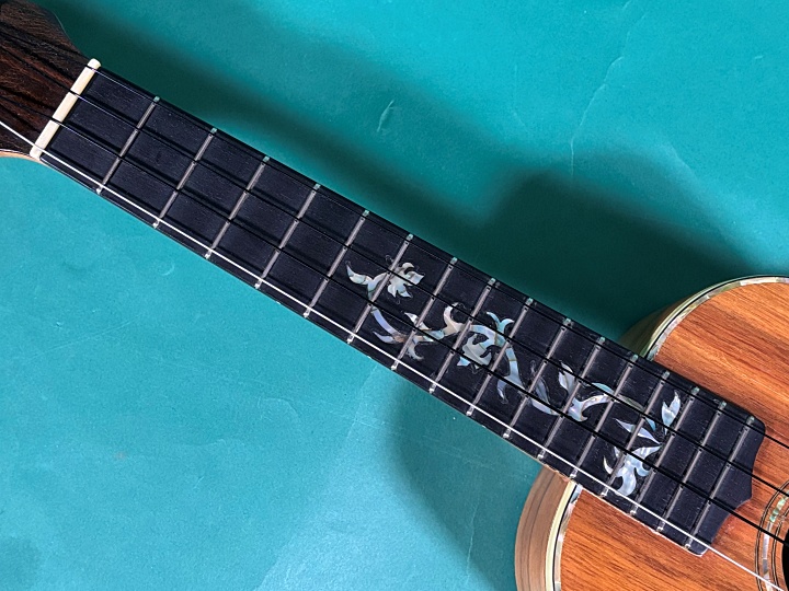 指板はエボニー、アバロン貝のツリーオブライフインレイが施されています。ヘッドプレートはローズウッドです。