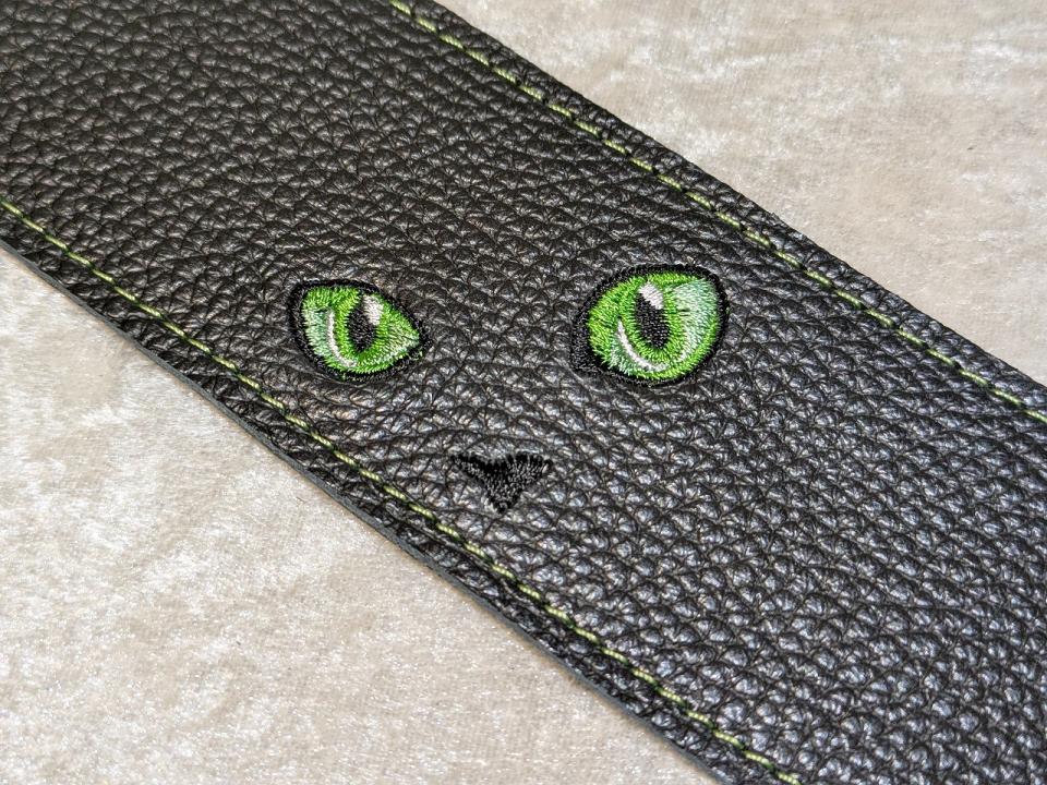 こちらは8月の誕生石【ペリドット】をイメージカラーに猫の目を刺繡したストラップです。