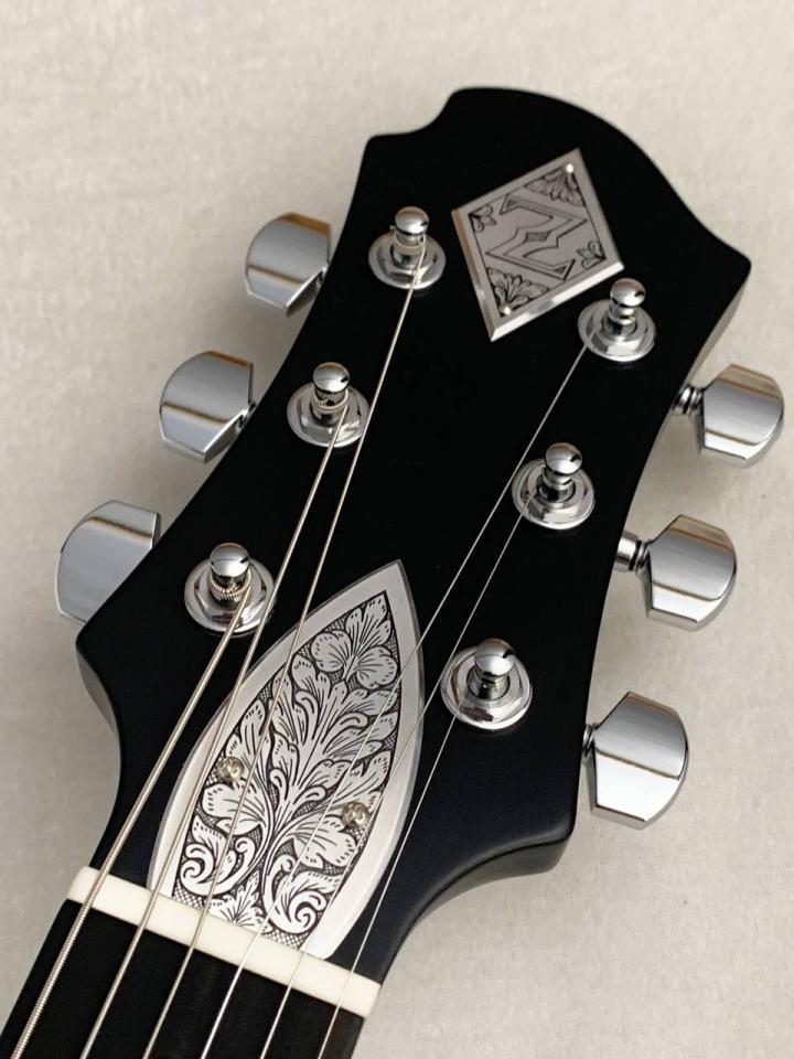 同様にアルミ合金を用いたヘッドのダイアモンド・エンブレム、トラスロッド・カバー、テイルピースやコントロール&スイッチ・バック・プレートに至るまで彫金を施しています。
