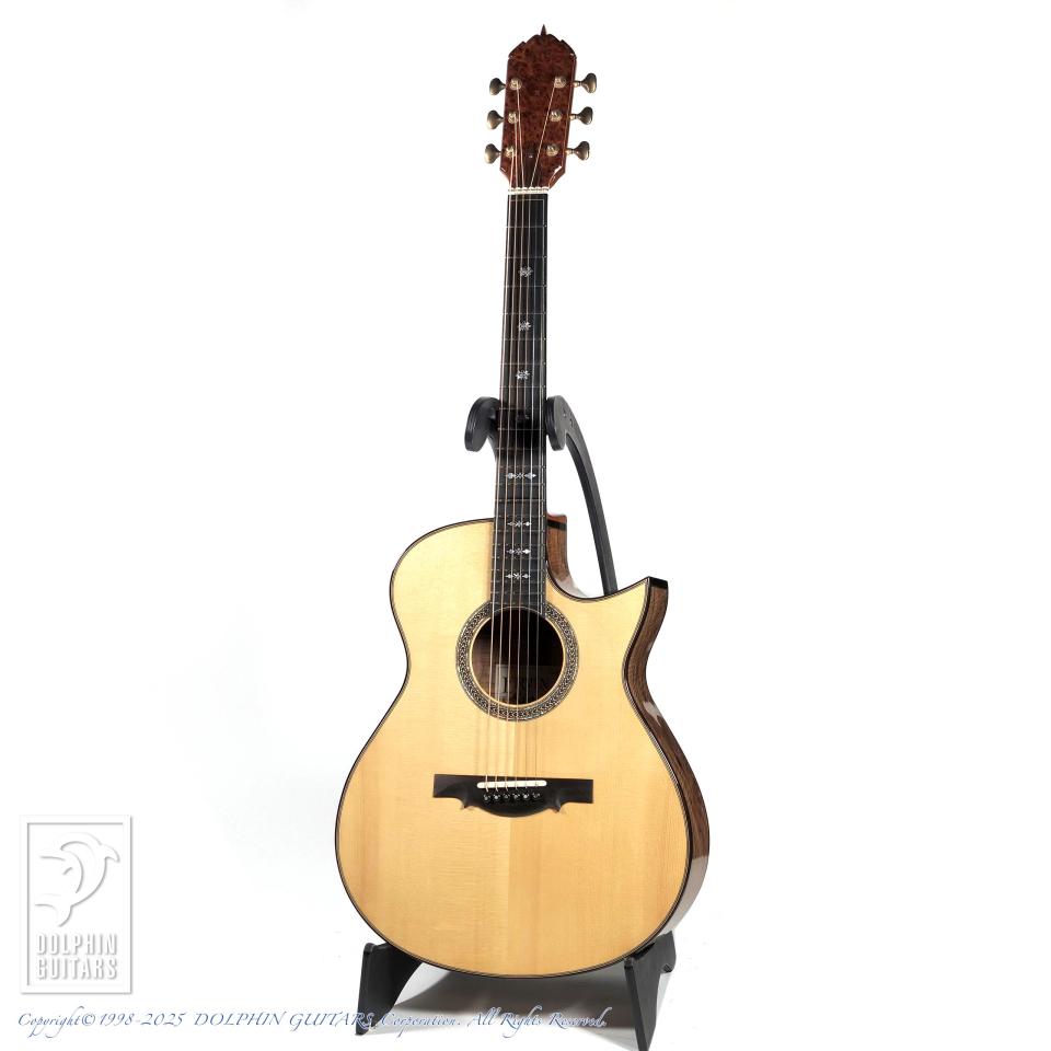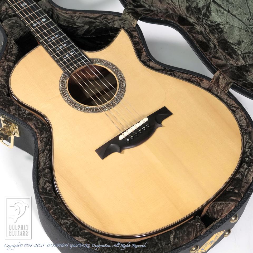 本器は珍しいマートルウッドを使用した2005年製の美しいOM Cutaway、極上USED品。