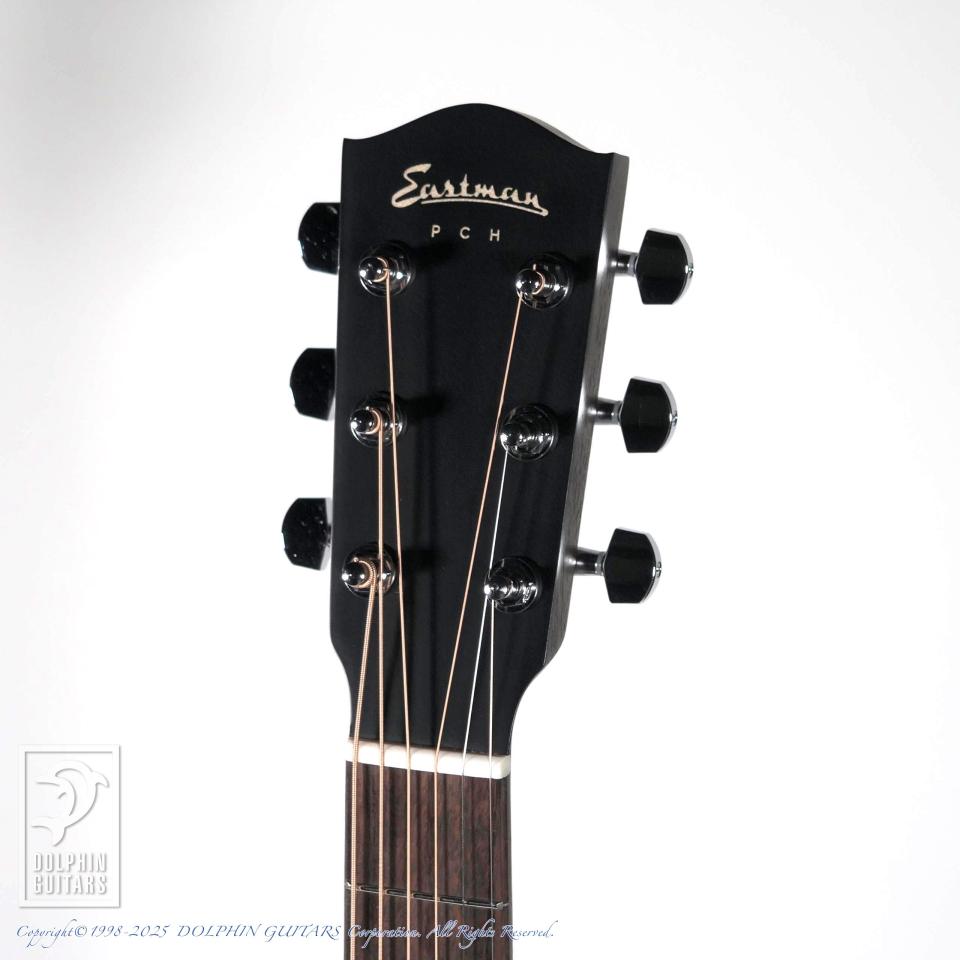 イーストマンのフラットトップシリーズの中でも特にコストを抑えたモデルでありながら、妥協のないクオリティに驚かされます。窯の中で木材を低温で焼くことで湿気を取り除き、新品でありながらヴィンテージ品のような経年変化を感じさせる、独自のサーモキュア処理を施した単板のスプルースを採用しています。また、当社が傘下に収めるハイエンドブランドであるボジョアギターズのメゾットによる、独自のフィニッシュ「トゥルートーンフィニッシュ」はギターの音色を損ねることのないように構成されています。