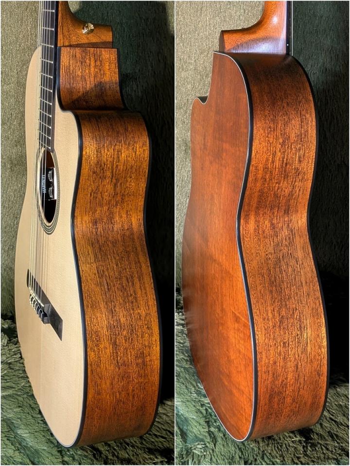 ボディ材はスプルース単板トップにマホガニー単板のサイド&バックのオール単板仕様となっており、指板は樹脂製では無くエボニー仕様。音色は柔らかめな印象で、ボッサやポップスなど弾き語りのスタイルによくマッチする印象です。