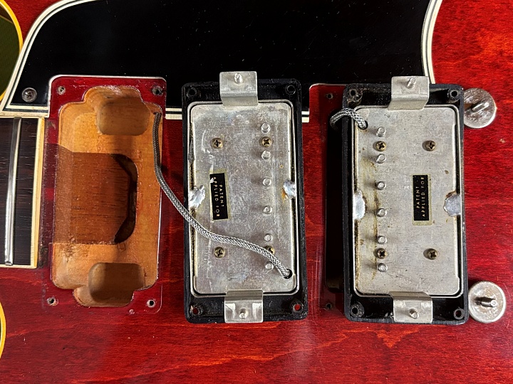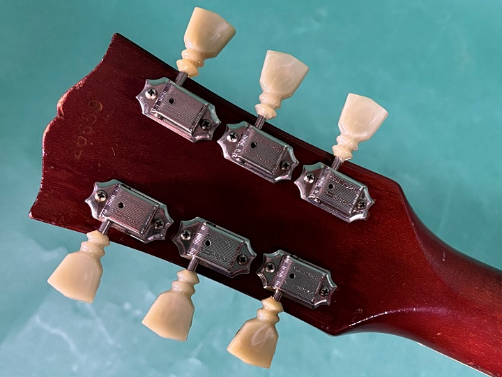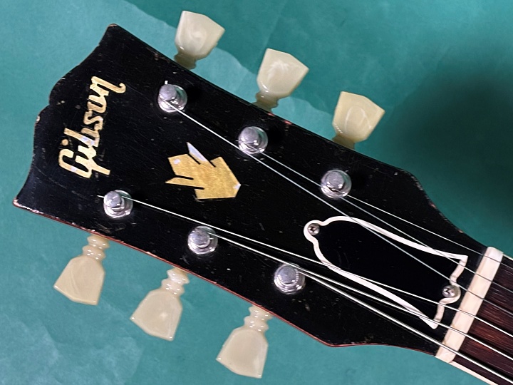 ボディはメイプル、ネックはマホガニー、指板はハカランダ、ピックアップもオリジナルのPAFが2基搭載されています。トグルスイッチは交換されておりますが、その他はコンデンサーはバンブルビーでポット共にオリジナルです。ペグは2~6弦がGIBSON DELUXEの刻印入りの70年代のモノに、1弦はKLUSON DELUXEの刻印の入った1964年以降のモノに交換されており動作はスムーズです。オリジナルのペグも付属しますが、ペグボタンのシュリンクやサビなどで実用的ではないかと思います。BIGSBYを取り付けていた痕があり、そのBIGSBYも付属します。テイルピースはWSC刻印入りのアルミ製のモノに交換されております。ブリッジはオリジナルのノンワイヤーのABR-1ですが、ワイヤーをひっかけてサドルが落ちないようにしてあります。