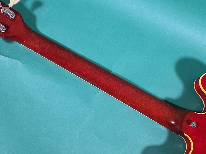 古い楽器らしくウェザーチェックはしっかり入っております。また指板には長年の使用によって爪でえぐれた凹みがローポジションメインにところどころあります。ピックガードのリアピックアップ付近に長方形の痕があります。この年代の実際使用されてきた楽器としては、比較的綺麗ですがバックルキズ、その他小傷はそれなりにあります。
