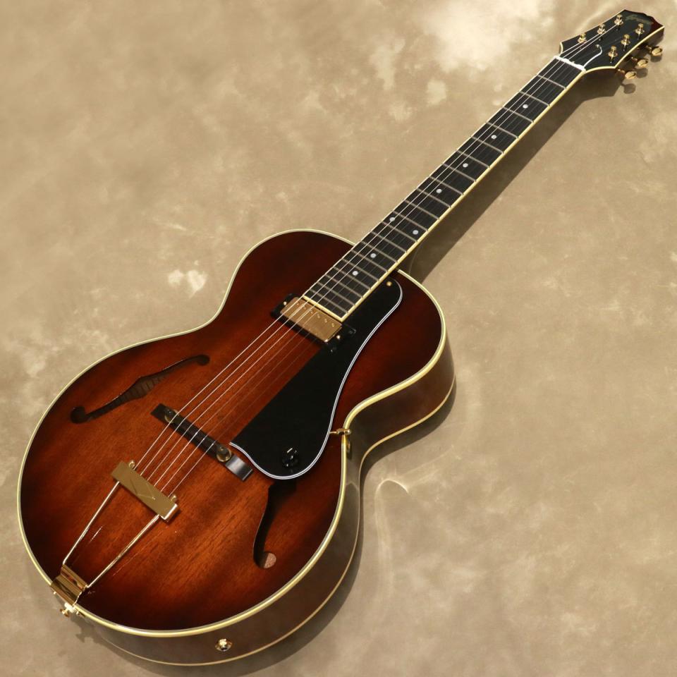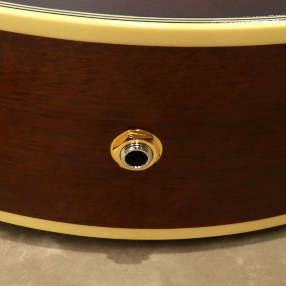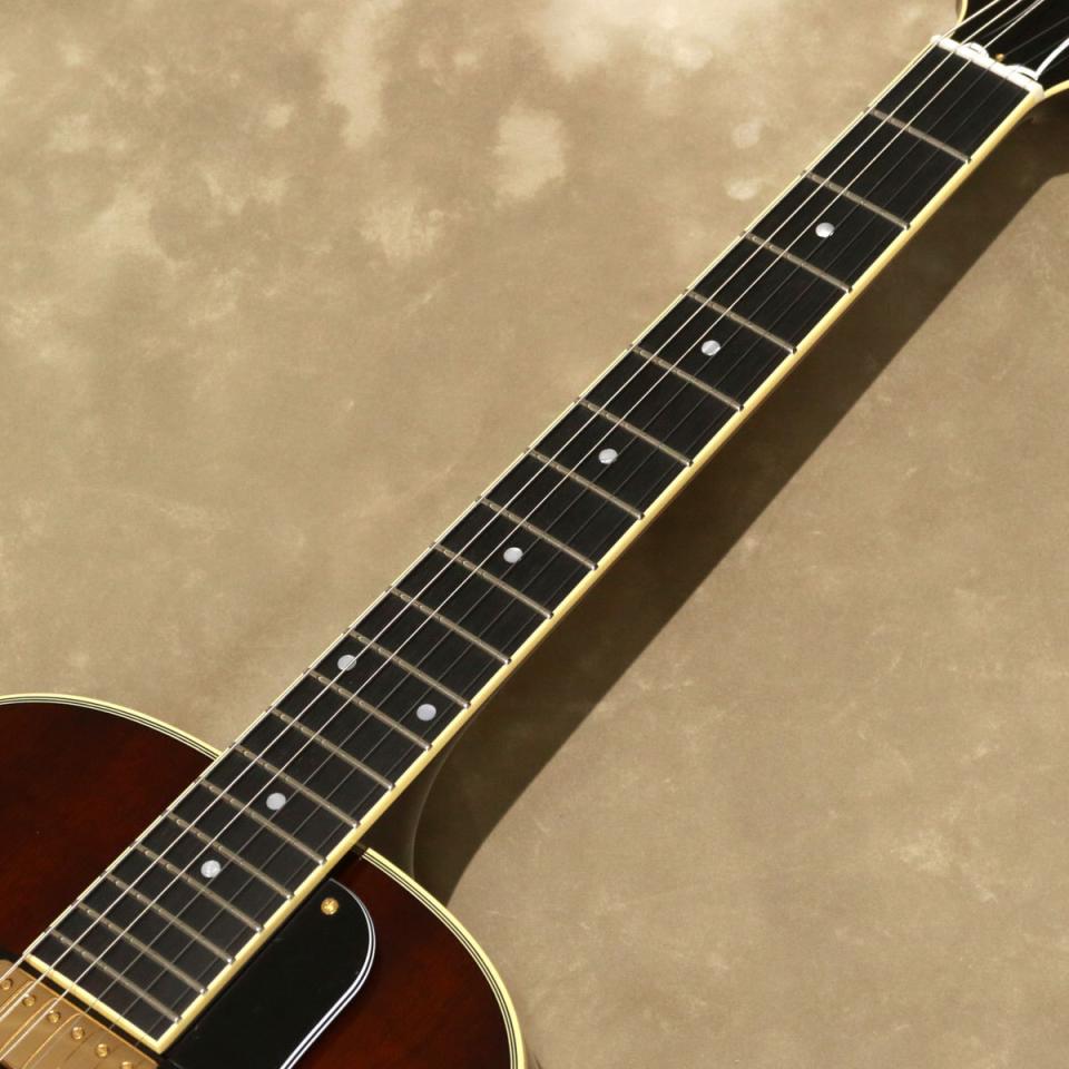 ボディーはマホガニー・トップ、サイド&バックで、Xブレーシングを採用したアーチトップのフル・アコースティック構造です。