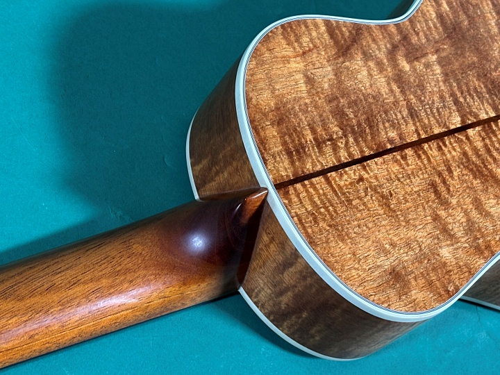 ボディー材は厳選され、見る角度によってフレイムが浮かびあがる美しいソリッド・コアウッド、ネックはマホガニー、エボニー指板、ロゼッタリングとトップのパーフリングに美しいアバロン貝の装飾がみられる高級感あるルックスです。