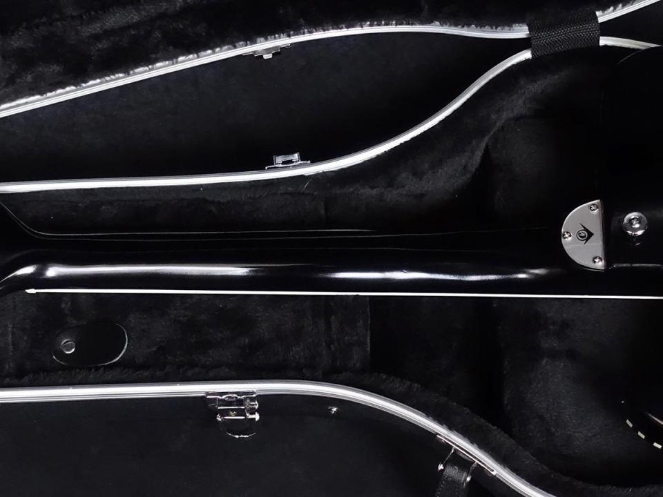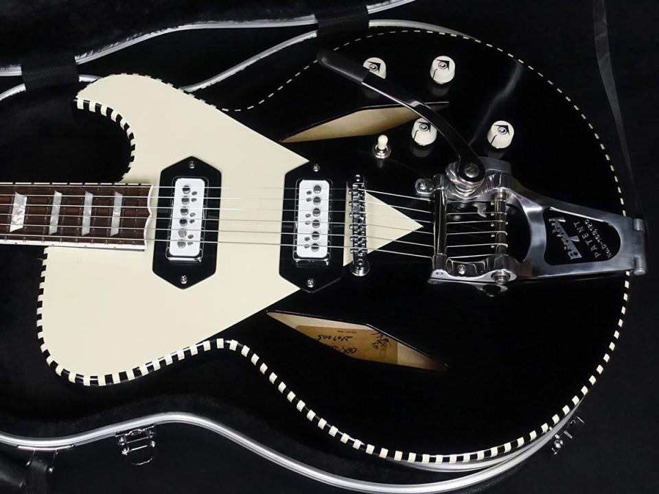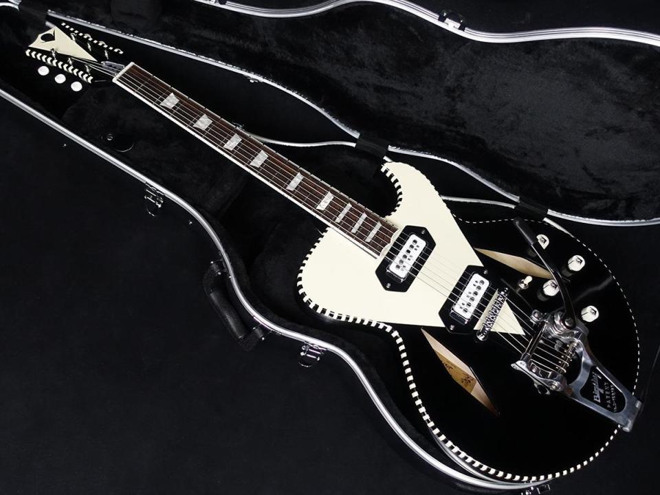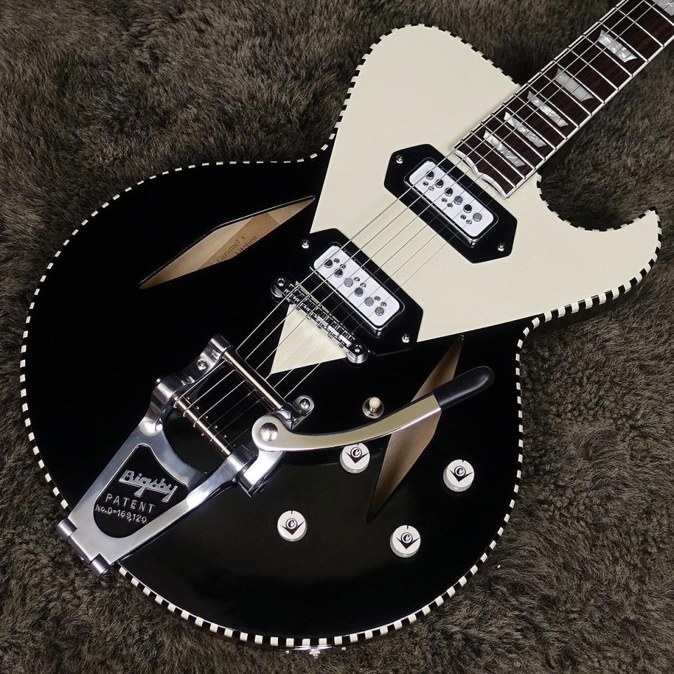 Vモチーフとチェッカードステッチのツートーンカラーを施し、シャープな「くびれ」のあるオリジナルボディライン。ダイアモンドfホール、そしてビグスビーのビブラートユニットB7があいまって一際目を惹く個性的なデザインのセミアコースティックギター。
