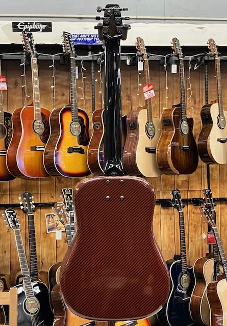 カーボン製ボディ(ブリッジはウォールナット)にマホガニーネック、チェリーフィンガーボードのカーボンと木材のハイブリッドなマテリアルです。