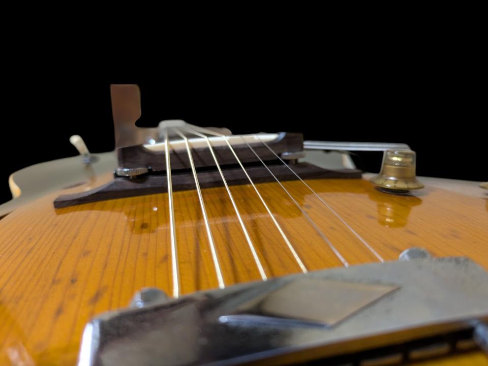 ④写真にあるように1弦側サドルを6弦側より高くしないと1弦2Fがビビります