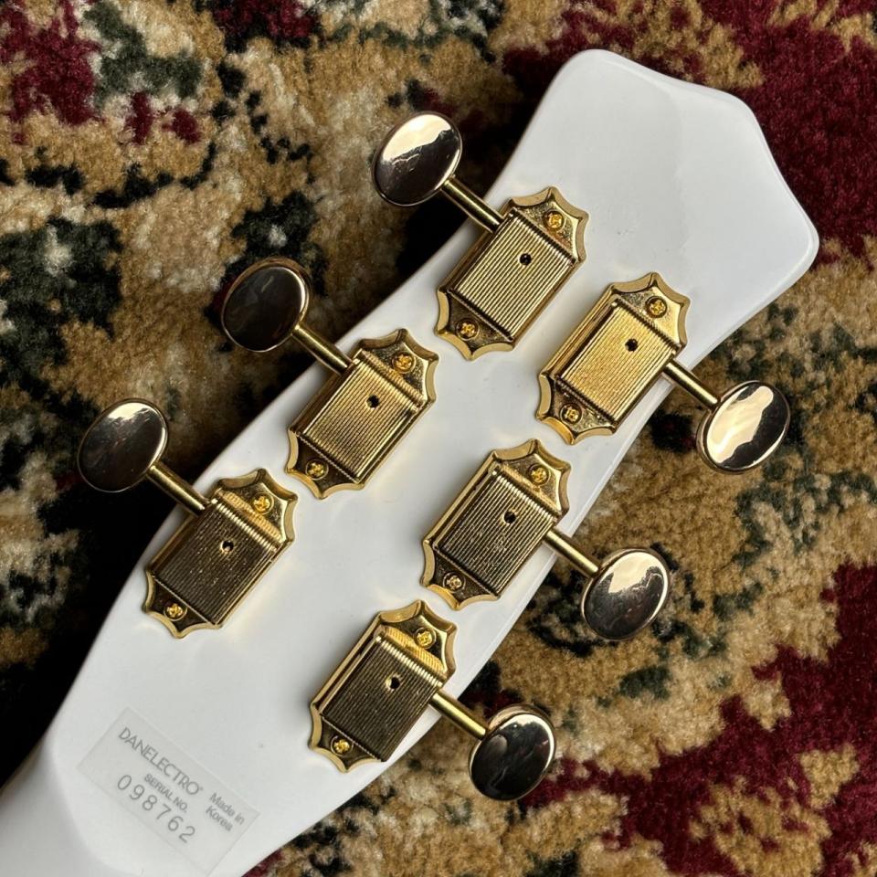 上品な雰囲気のゴールドパーツにホワイトのカラーが唯一無二の存在感を醸し出します。独特のボディシェイプに、 倉庫の奥から発見されたビンテージサウンドのN.O.Sピックアップの特徴を引き継ぎ、抜けの良いハイと、パンチの有るミドル、ソリッドなローを備えた新設計のピックアップ「N.O.S+pickup」を搭載。もちろん、ダンエレクトロギターの特徴である、サイドのテクスチャやメタルナットを採用。バダスタイプのブリッジを採用し、サウンドと利便性を向上させたモデルです。