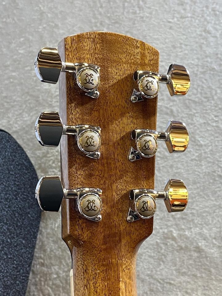 トップは霜がたっぶり降りた冬目くっきりシトカスプルース、サイドバックは、うっすら杢の出ている端整なマホガニーが使われております。ヘーゼルナッツ色したマホガニーとスプルースがなんともおしゃれで上品な色合いです。