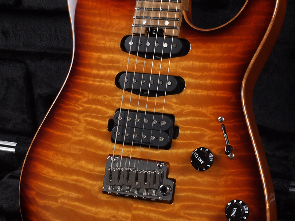 HSSレイアウトのピックアップは全てセイモアダンカン製を搭載。Full Shred SH-10B(ブリッジ)、Custom Flat Strat SSL-6(ミドル)とCustom Flat Strat SSL-6 RWRP (ネック)のコンビネーションにより、燃え上がるようなリード・サウンド~パワフルなクランチリズムトーン、クリスタルのようなクリーントーンまで多彩な音色表現が可能です。