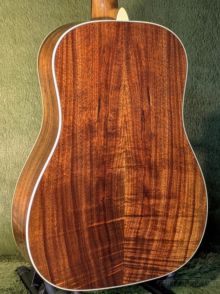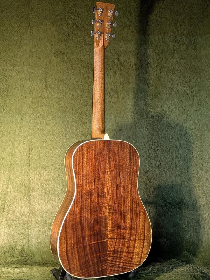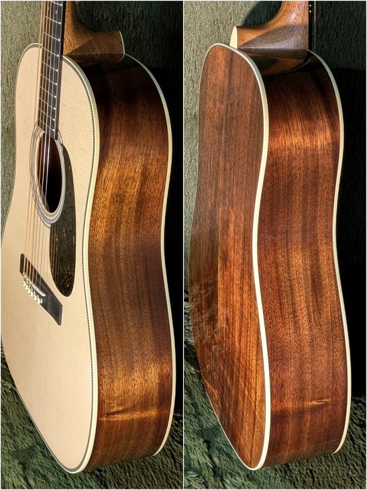 ボディは、ショートスケール&14フレットジョイントのスロープショルダー・ドレッドノートスタイル。トップにスプルース、サイド&バックには美しい杢目が映えるハワイアン・コア単板を採用しています。