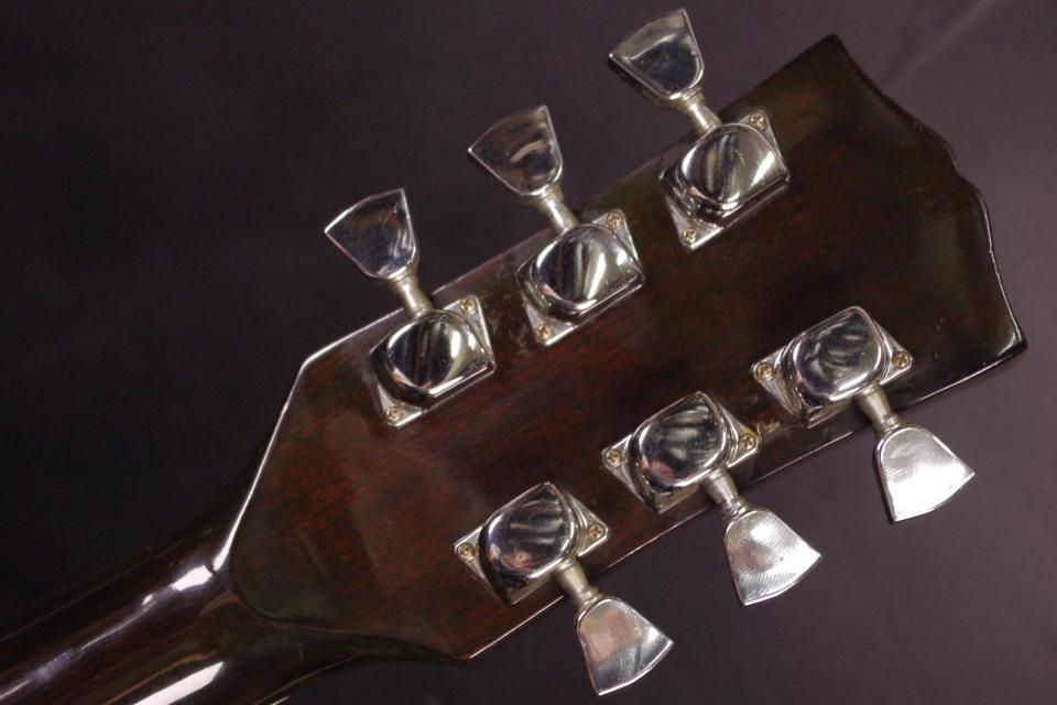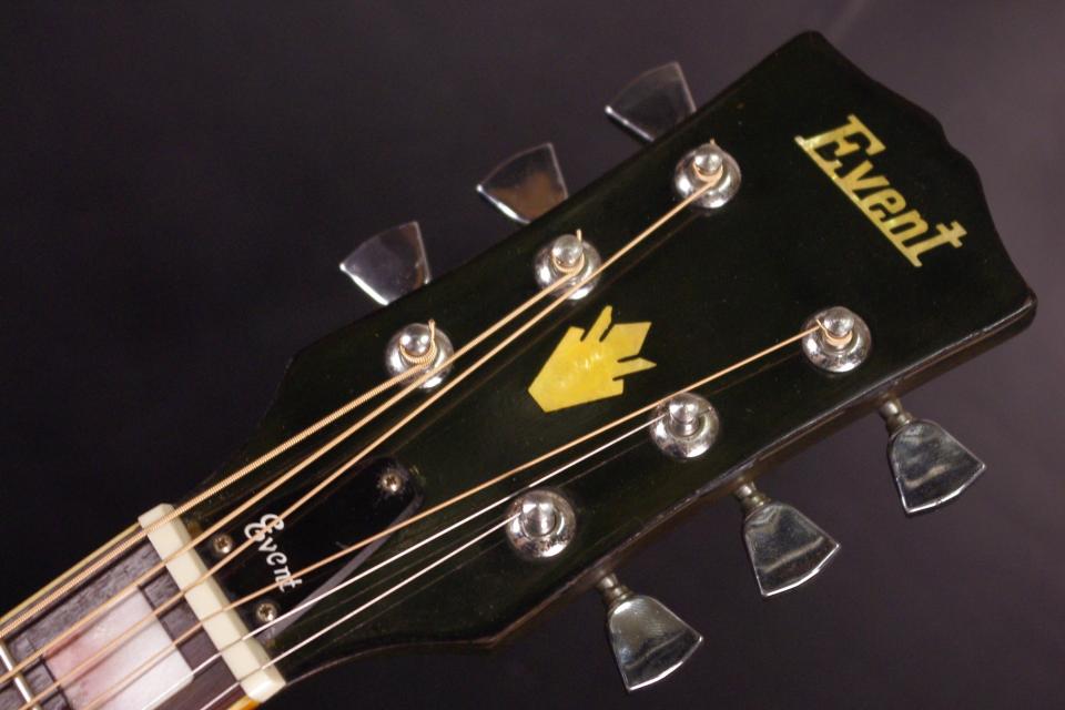 1970年代のGibson ハミングバードをコピーした珍しいジャパンビンテージ!EVENT No.20が入荷しました。トップはスプルース、サイドバックにはマホガニー、指板とブリッジにはローズウッドが有力です。指板には70年代のギブソンに採用されたブロックポジションマークが入っています。ノーマルサドルのベリーブリッジも特徴です。ペグ、ピックガードもオリジナルで残っています。ピックガードは浮きが出ていますが演奏上は支障ございません。全体的に傷はありますが雰囲気がよく状態も落ちついています。ブラウンサンバーストカラーも魅力ですね。ナット幅は約44mm、やや厚みがありしっかりとしたネックグリップです。アングルも適正でトラスロッドの動作は硬さを感じるところまで締めて調整しています。問題なく機能しています。フレットの減りも少なく今後も安心です。サドル残は少なめで調整に余裕はございませんが弦高は12フレット6弦側で約2.8mm、1弦側で約1.7mmの高さで押さえやすく調整しています。弦長は約645mmとっており各弦にしっかりとハリがあります。指で弾くと優しい温かなサウンドで癒されます!ストロークでは軽快でジャキジャキと歯切れがよいです!是非この機会にどうぞ!汎用ハードケース付。