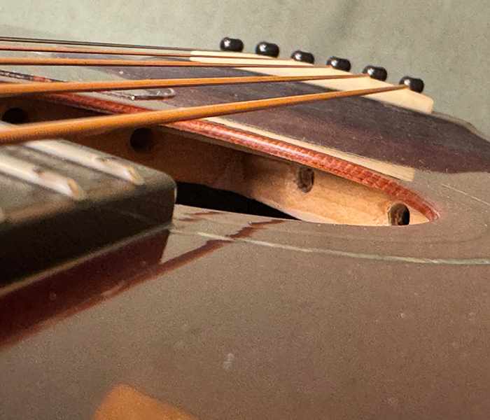 トップ材の振動を最大限に活かすため、ブレーシングに複数の穴を穿つエアリーブレースを採用。