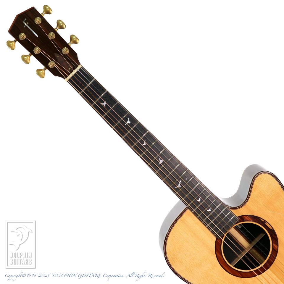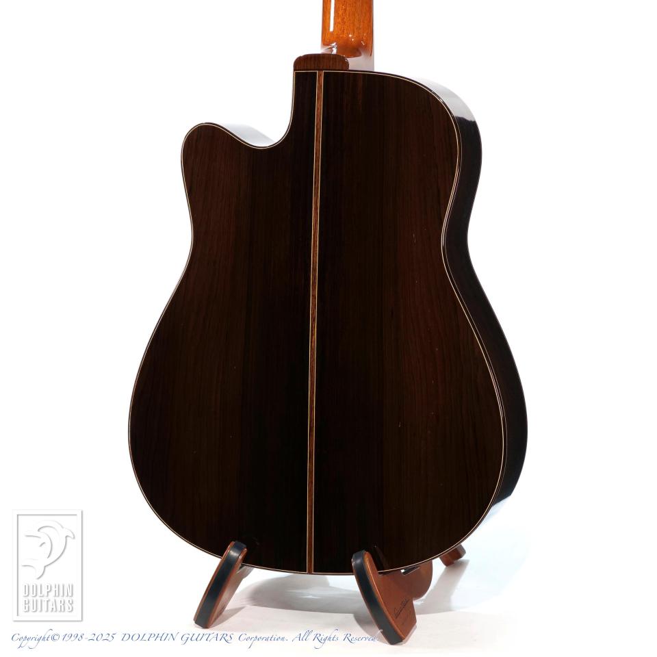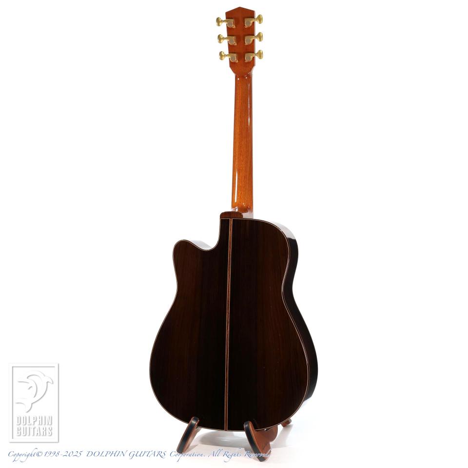 ジャーマンスプルースとハカランダの組み合わせにより、ふくよかな低音と煌びやかな高音が美しく調和した、豊かな音色を生み出します。密度の高いサウンドで、指で弾いてもしっかりと響くレスポンスの良さが魅力です。ナット幅44mmのややワイドなネックは握り込みやすく、フィンガースタイルでも抜群の弾き心地を提供。カッタウェイ仕様によりハイポジションでの演奏も容易で、コードストロークから繊細なフィンガーピッキングまで表現力豊かに対応します。