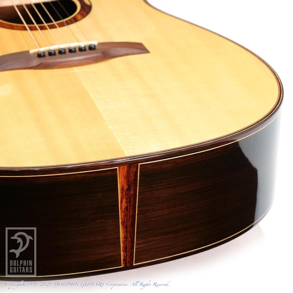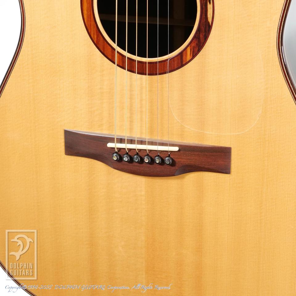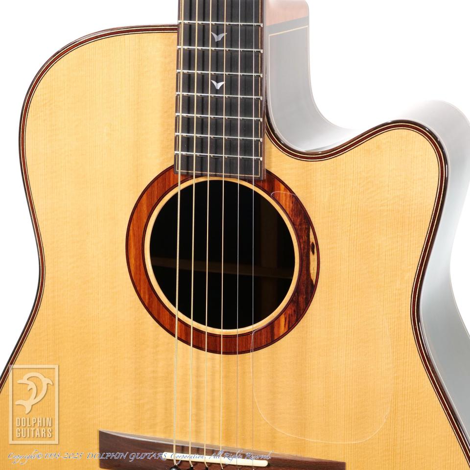 ドレッドノートサイズのカッタウェイボディは、堂々とした存在感を放ちます。ヘッドのデザインにも上品さが漂い、トップのジャーマンスプルースは緻密な木目とサイド&バックのハカランダは重厚で美しい木目が際立ちます。随所に凝らされた装飾が、外観に上質な風格を与えています。