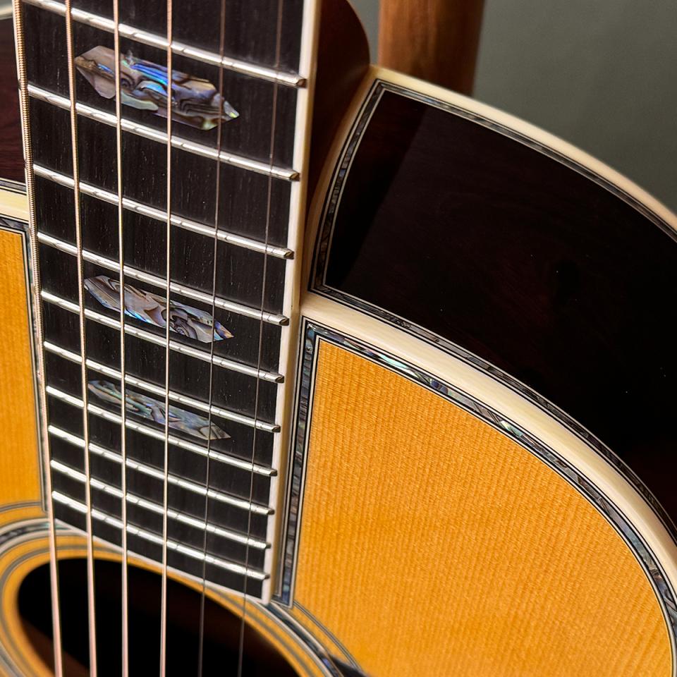 通常であればニューヨーカースタイル(609mm)となるところを、14フレットジョイントのまま635mmで設計し、フォークサイズとして構築した希少なカスタム仕様となっています。