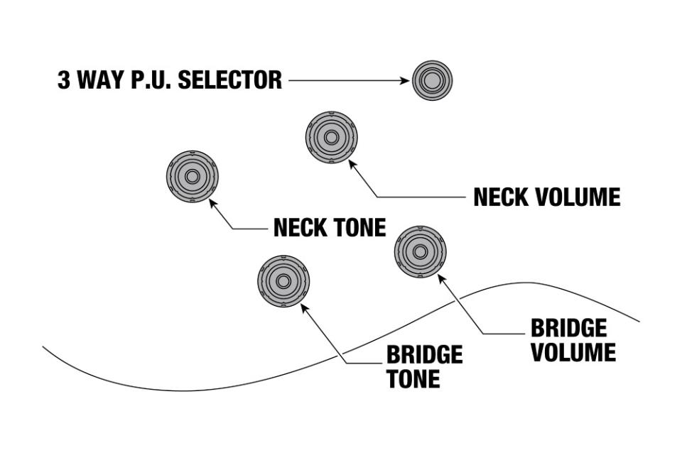 - Controls, Pickup selector 2 Volume, 2 Tone, 3-way toggle switch