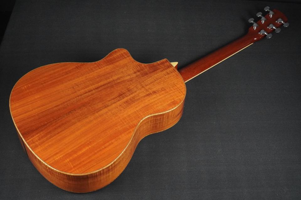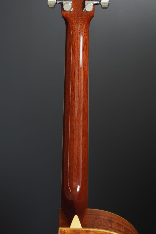 648mmスケールでナット幅は44mm、そしてやや薄めで握り易いUシェイプのマホガニーネックから演奏性が良く、細部のスペックも指板とブリッジはエボニーでポジションマークとブリッジにもカスタムインレイが入っており、ヘッドのカスタムインレイやウッドバインディングなどからもセンスの良さを感じさせる仕様となっております。