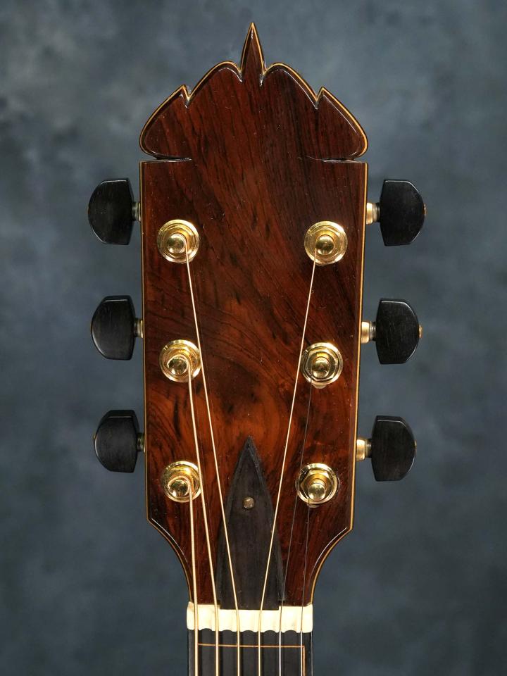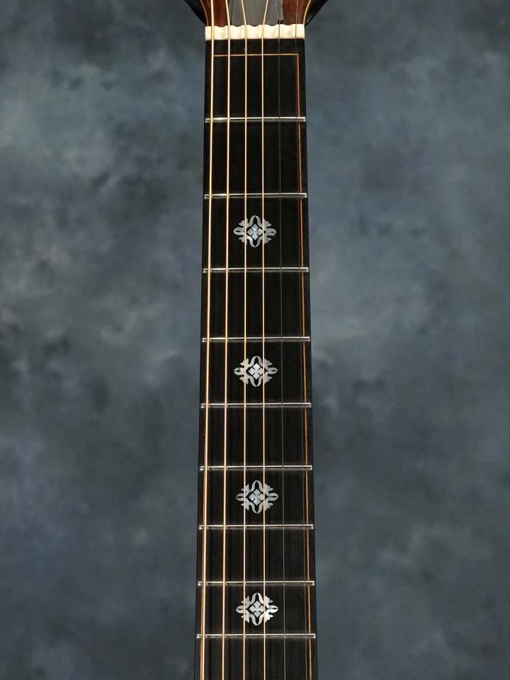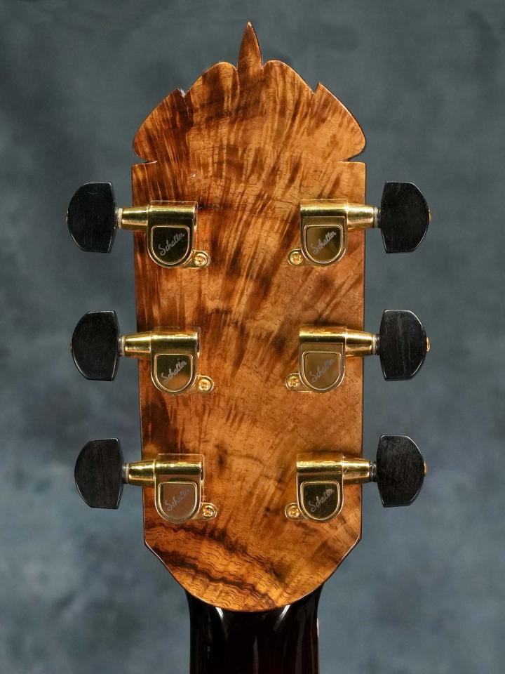 ヨーロピアンスプルースTop&ハカランダ(Brazilian Rosewood)Side/Backのカッタウェイ・スモールジャンボボディ、マホガニーネック、スキャロップナット、エボニーノブのシャーラーゴールドペグ、”ファンシースノウフレイク”インレイの入ったエボニー指板、ハカランダブリッジ、ピッチが補正された厚手のサドル。