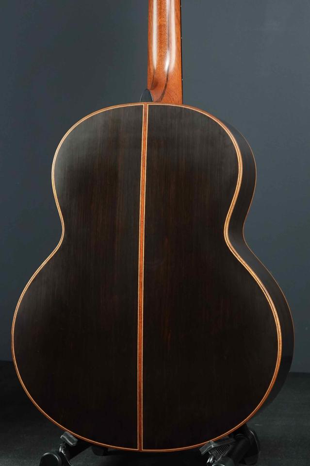 ウッドインレイのローデンロゴが入ったヘッドの裏面にはウッドのヘッドプレート、チューナーにはGotoh510のゴールドのペグでエボニーのペグボタン、指板はエボニーでシンプルにポジションマークは無く、キリッとウッドバインディングが巻かれた、シンプルながらも質感の有るエレガントなスタイルです。