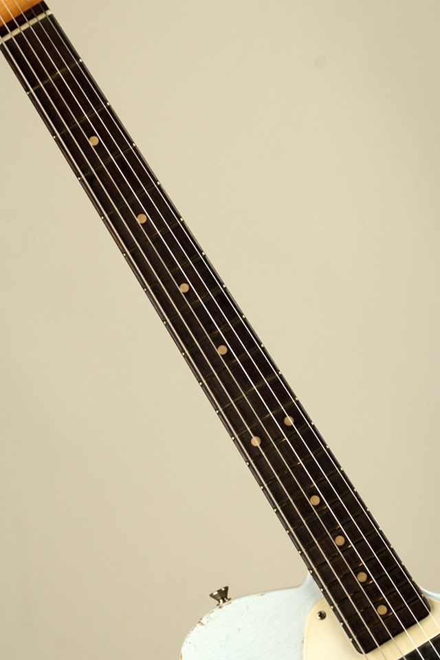 当機60's Whiteguardはローズ指板採用初期の60sTelecasterを見事に再現復元した個体で、60sスタイルのCシェイプ調グリップにスラブ・ローズ指板、ソニックブルーの1本です。