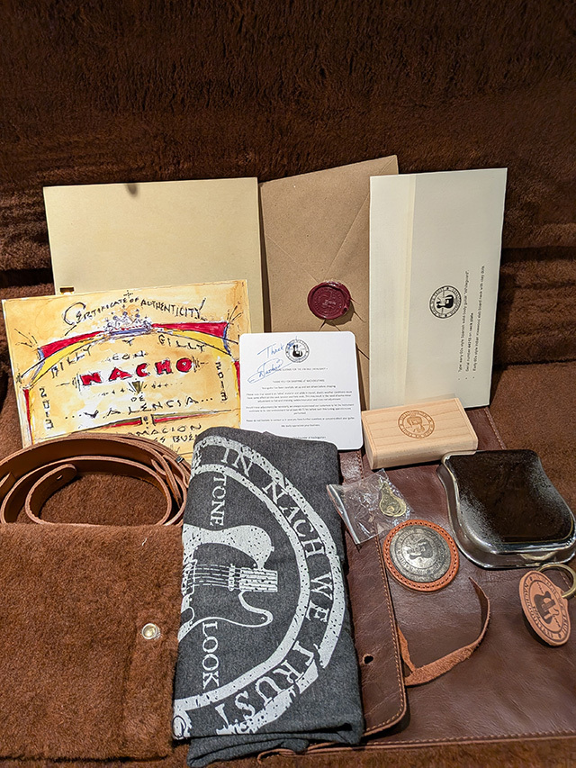 ツィードハードケースの他、オリジナルストラップ、50年代当時のFender資料のコピー、スペック等が封入されたレター、オリジナル・レザーバック、ブリッジプレート、当機の画像データが入ったUSBとUSB用の木箱も付属します。