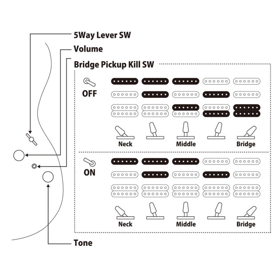 VOLとTONEの間にあるミニスイッチは、リアPUのキルスイッチになっています。レバースイッチをブリッジ側にした状態でミニスイッチをオンにすることでスイッチング奏法が可能になります。