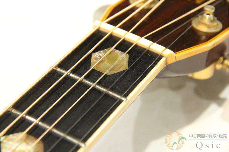 ボディ外周のインレイや、指板のヘキサゴン・インレイ、特徴的な縦ロゴ部分にまで高級なアバロンで仕上げられた、目を瞠るような豪華なスペック。
