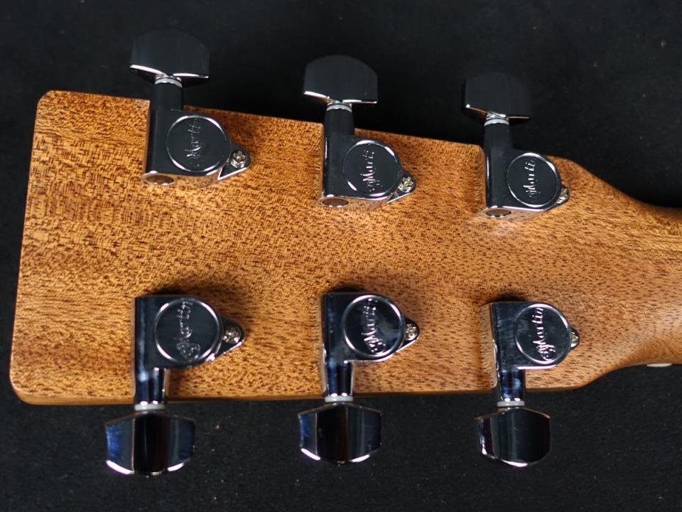 艶消し仕上げで装飾を抑えながらも、ロゼッタ(サウンドホール周りの装飾)やドットポジションマークにはマザーオブパール柄を使い、さりげない高級感を出しています。