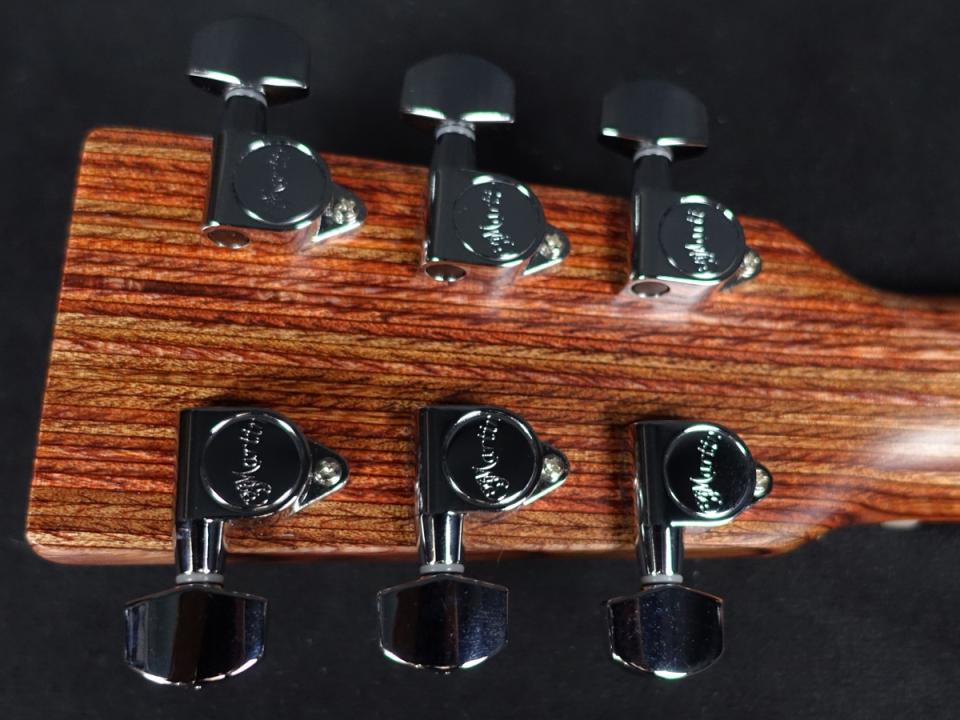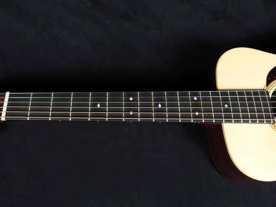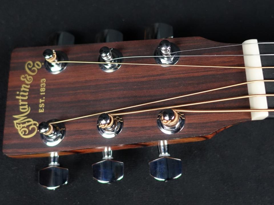 サウンドホール周りにはレーザー彫刻で減リングボーン模様のロゼッタをあしらい、指板にはダイヤモンド&スクエアpatternのインレイを施しべっこう柄のピックガードを装着した、よりトラディショナルなマーチンの雰囲気を感じさせる一本です。
