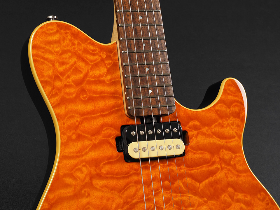 EVHの愛機としてあまりにも有名な”Axis”のデザインを正当に継承したモデルで、美しいキルトメイプルベニヤをラミネートしたバスウッドボディに、代名詞でもある非対称グリップのメイプルネックをボルトオンし構成。