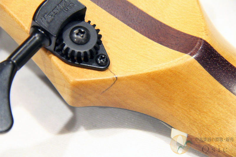 1弦ヘッド裏ヒビあり、ペグをグローバーからヒップショットに変更、ノブを純正の黒からクロームに変更、ブラックのブリッジを同型ゴールドに変更(元ブリッジ付属)1弦ペグ横にヒビ割れがあり接着された状態です。